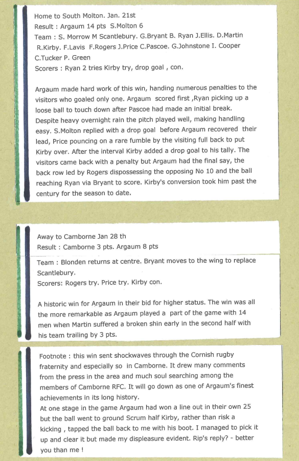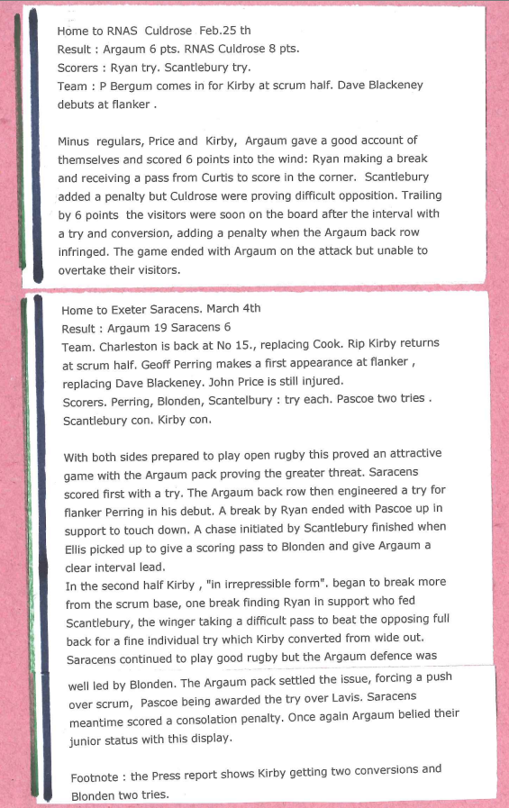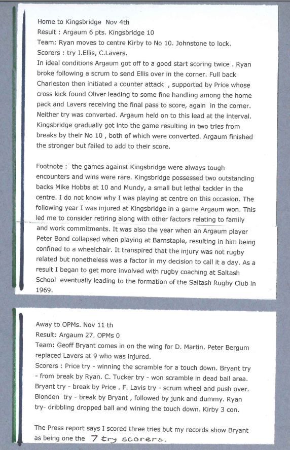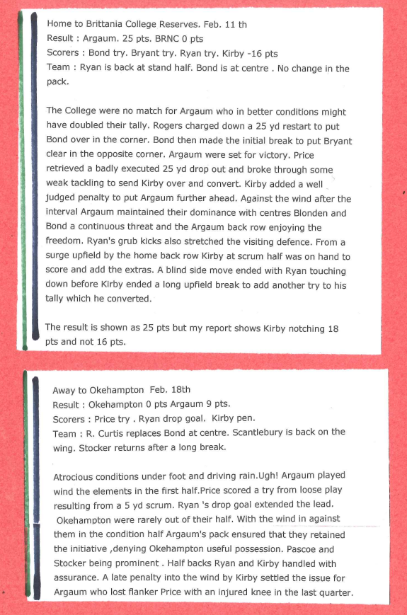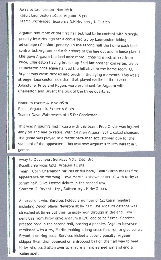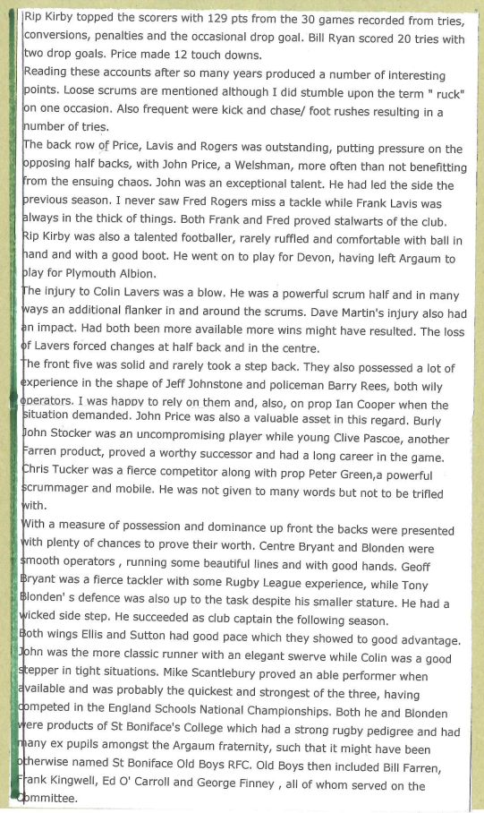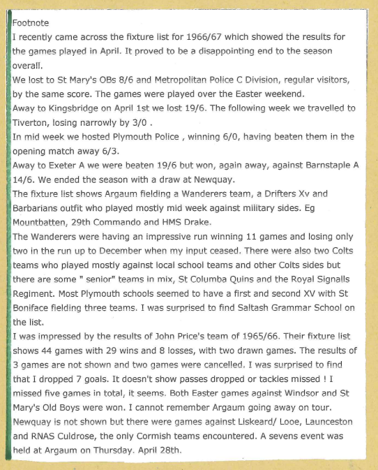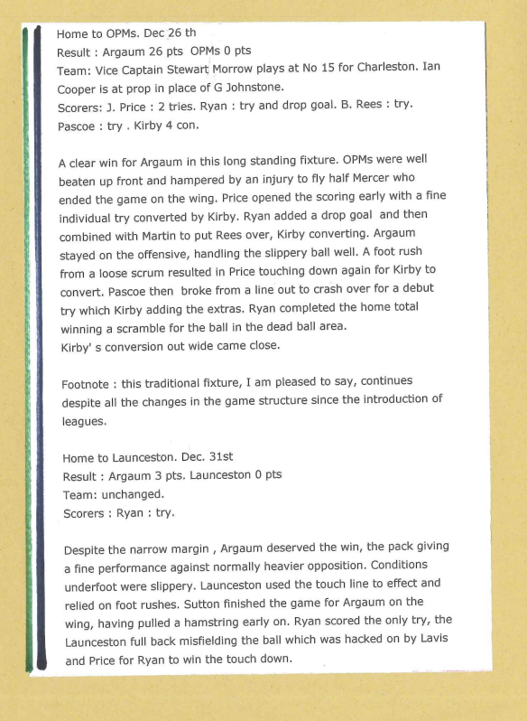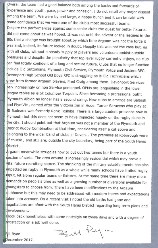 In addition there are wonderful insights about the way both the club and rugby in the region operated. Argaum was going through a very good period during the mid 1960s and this particular season saw arguably the club’s greatest victory, a defeat of Camborne, away, with 14 men! Bill, like many others at Argaum, was a product of St Boniface School and played for a number of seasons during the 1960s with appearances restricted by periods away from the area including Dublin and Twickenham. Returning to the area for a teaching post at Saltash High School, he was later instrumental in the formation of Saltash RFC in 1969 and its continued development till the present day, where he is Club President. Nevertheless Bill still finds time to pop into the reunions and is always interested to hear about the club’s progress.