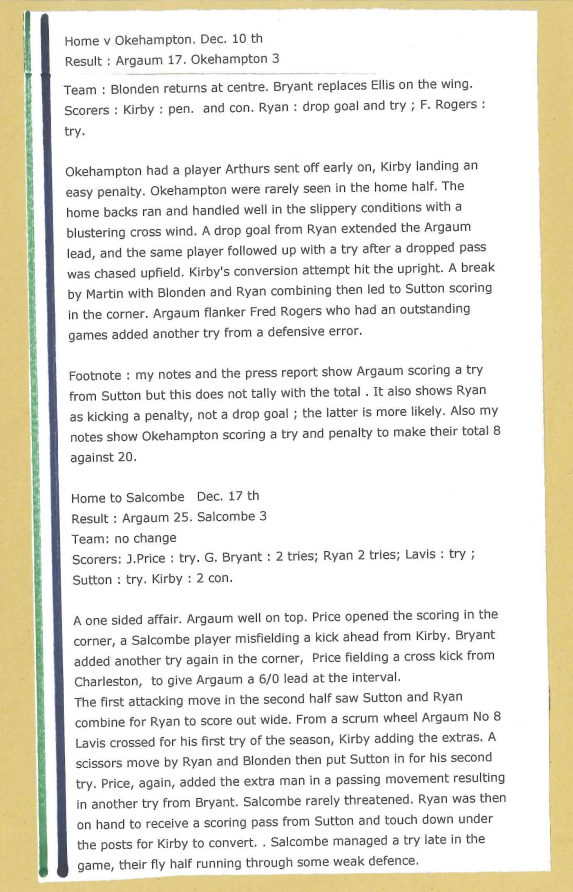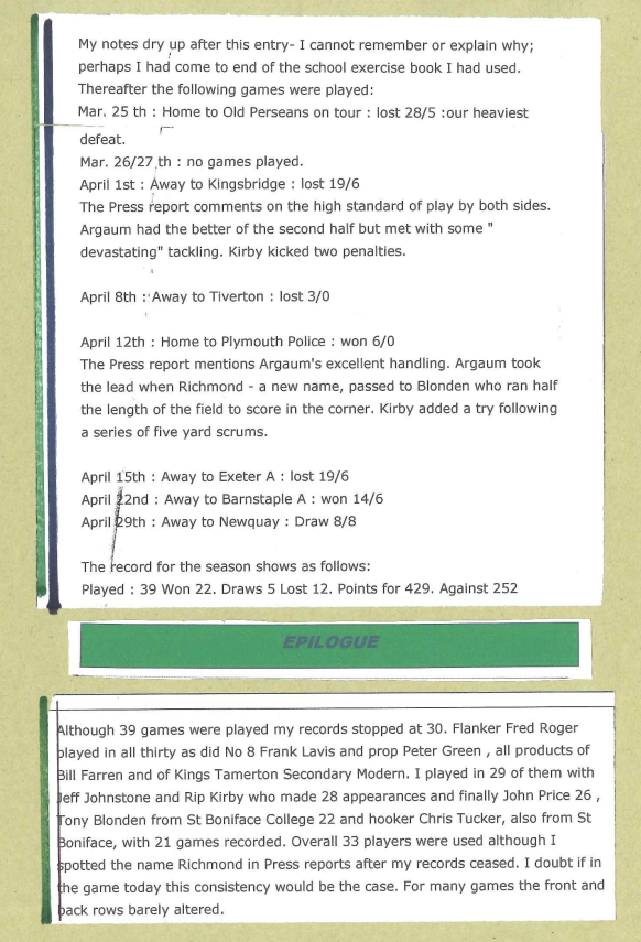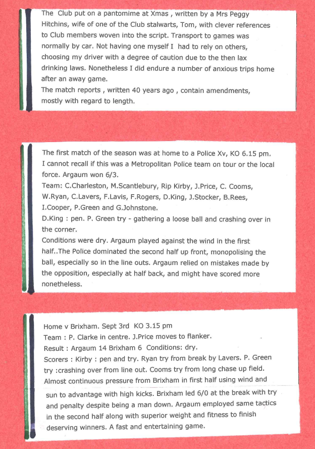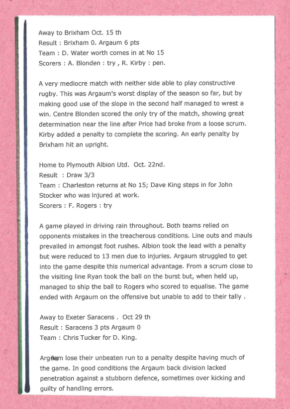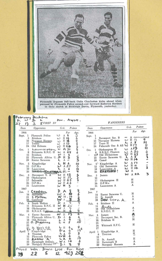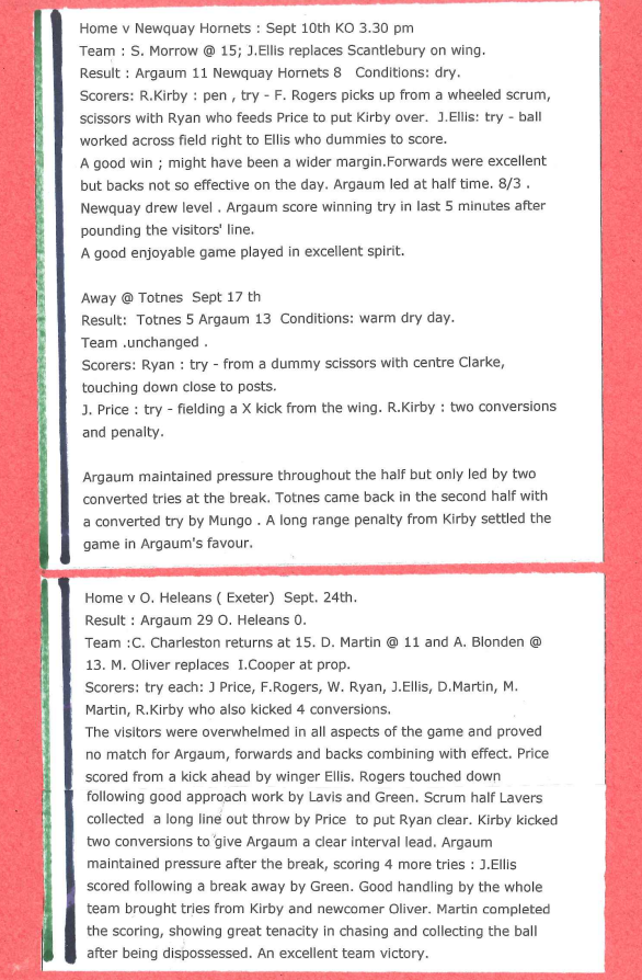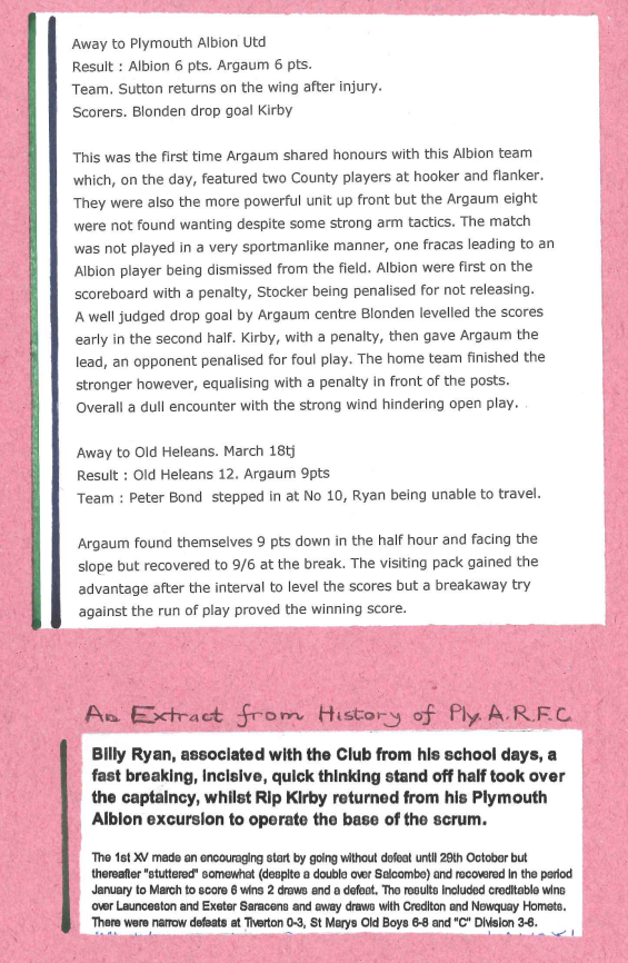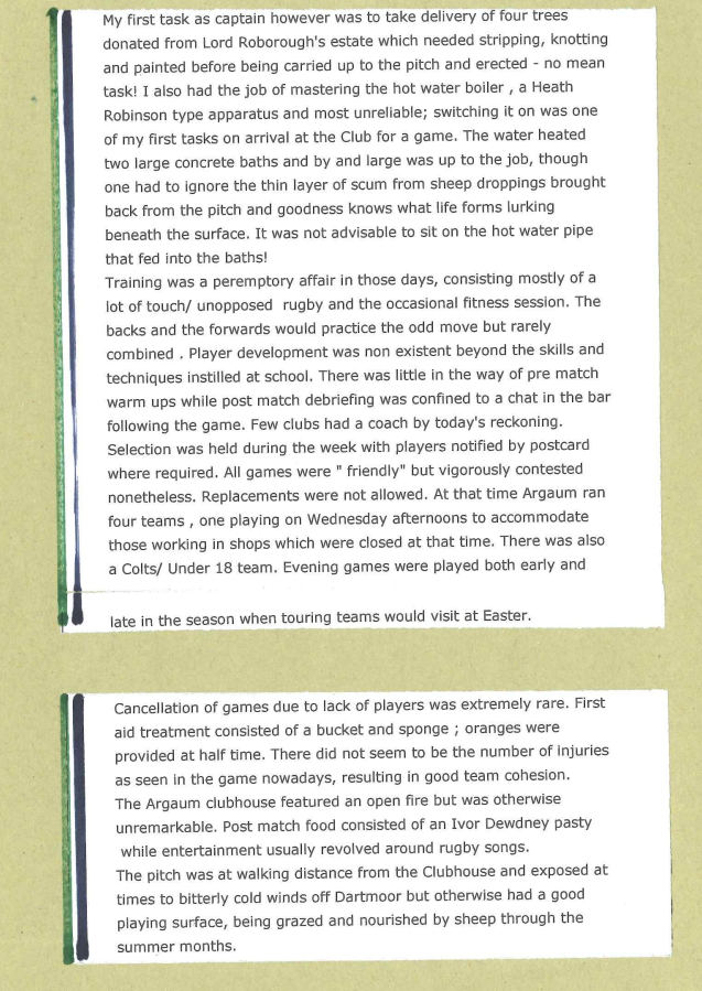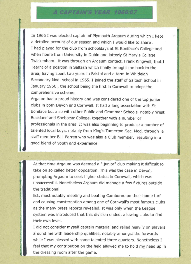 In addition there are wonderful insights about the way both the club and rugby in the region operated. Argaum was going through a very good period during the mid 1960s and this particular season saw arguably the club’s greatest victory, a defeat of Camborne, away, with 14 men! Bill, like many others at Argaum, was a product of St Boniface School and played for a number of seasons during the 1960s with appearances restricted by periods away from the area including Dublin and Twickenham. Returning to the area for a teaching post at Saltash High School, he was later instrumental in the formation of Saltash RFC in 1969 and its continued development till the present day, where he is Club President. Nevertheless Bill still finds time to pop into the reunions and is always interested to hear about the club’s progress.