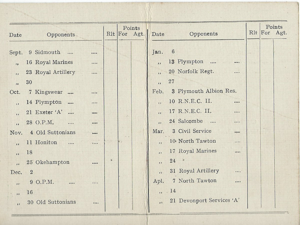 Tommy Lane continued as captain Harold Sloggett his deputy. The team for the opening game at Sidmouth included Lane, Westlake, Matthews, Sloggett, Rowden, Ross, Hitchins, Rendle and Len Giddy.