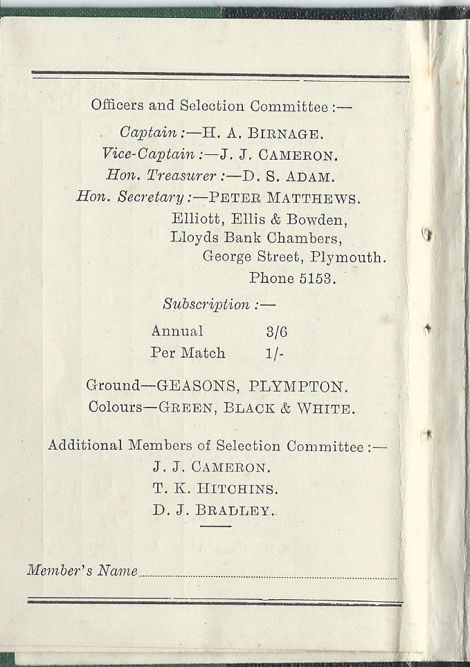 The 1st team record did not live up to such standards with a playing record of 11W, 16L, 166-272 which would seem to put the defence under suspicion. Salcombe inflicted no less than three defeats 4-6, 6-32 and 3-13 whilst Services A, Albion United (twice) the University of the South West and Civil Service, all inflicted heavy defeats a more encouraging defeat was that of 3-11 at Penzance Skip Floyd beating several men in scoring. There was a strong burst at the end of season, of 5 successive wins Rover Scouts 17-3, OPMs 7-6, DHSOB 11-4, Barnstaple Athletic 10-5 and Okehampton 12-5.