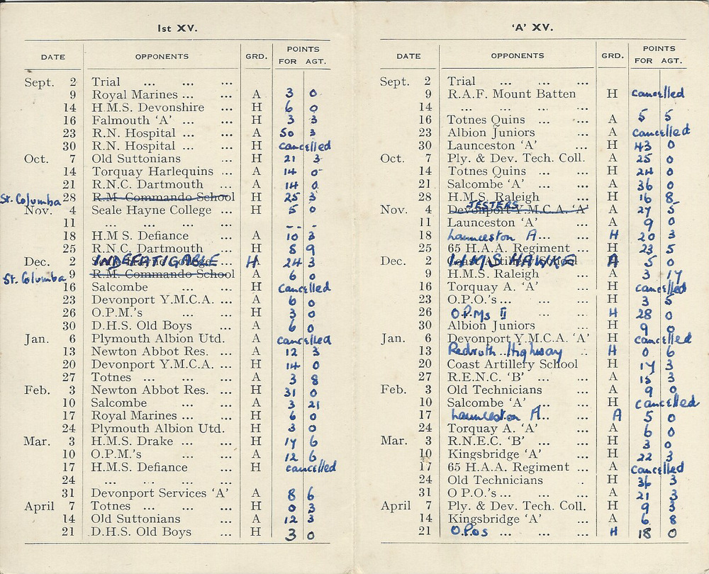 A back row of Farren, Maunder and Wreford, not to mention full back Bill Palmer, a long striding and long kicking last line of defence, comprised a formidable side which was, deservedly, awarded the RIVE College Cup as a club affiliated to the Plymouth and District rugby Combination with the outstanding record. Of its first seventeen fixtures the team won 15 drew 1 and lost one (8-9), continuing into the New Year with a further 10 wins and 3 defeats. Totnes did the double 3-8 and 0-3 and the one blot on the record Salcombe 3-21. The final figures W24 L4 D1 328-83, leading scorers – Jack Douglas and George Rhodes 51 points, Frank Kingwell 42 and Tim Daly 31.