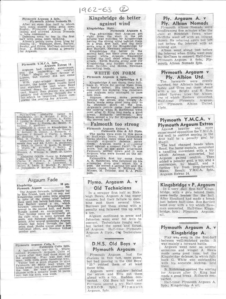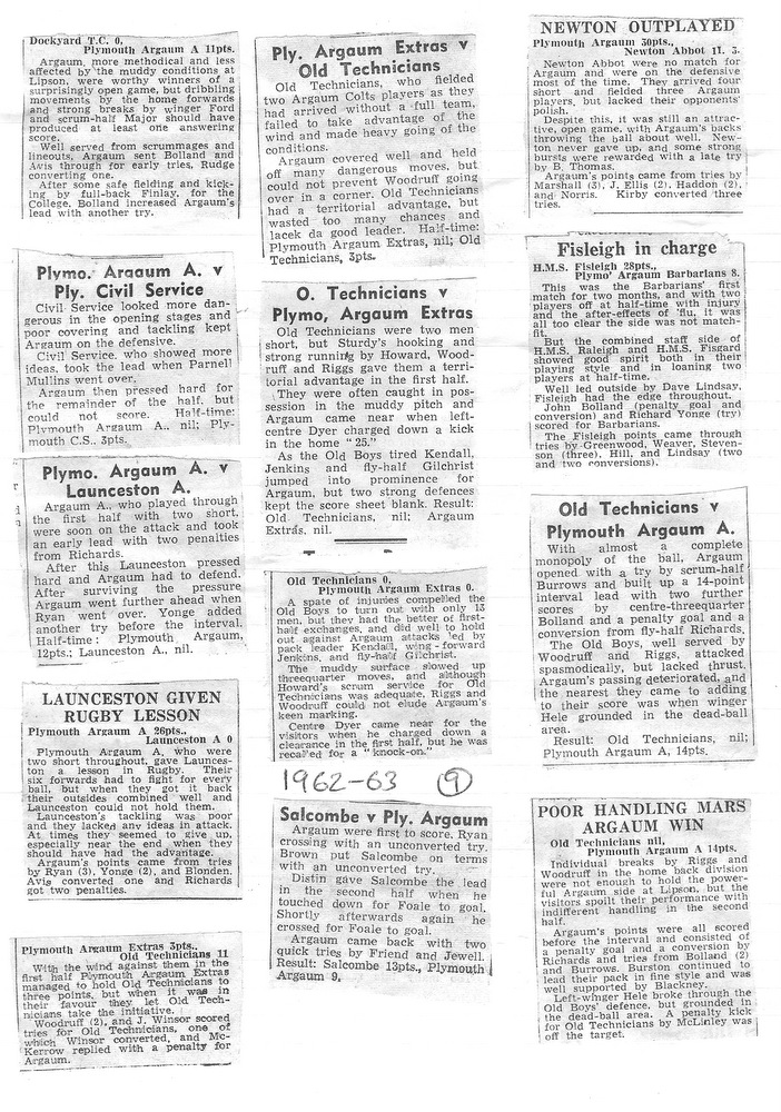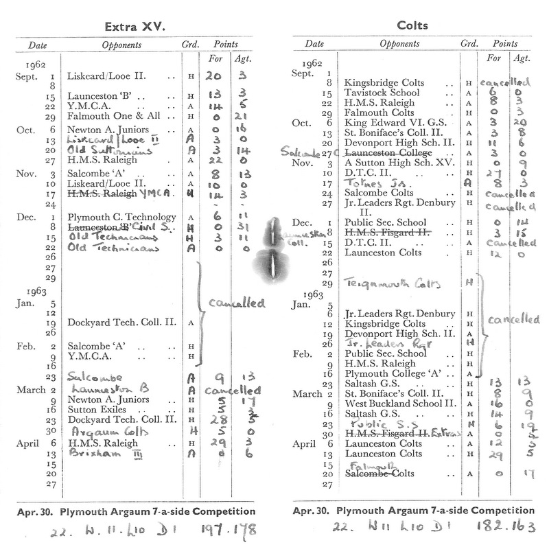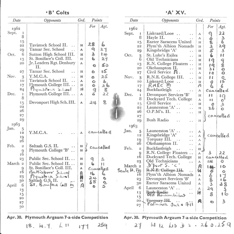 Thereafter followed a series of disasters, 6-30 v Exeter Saracens, Plymouth Albion United 0-36, Kingsbridge 0-18 and St Lukes Exiles 10-11. October 6th v Devonport HSOB, 10-9 brought temporary relief and the remainder of the year showed some improvement but no real consistency. Just before Christmas a big freeze set in resulting in 8 consecutive cancellations. Whether the 1st team were in need of the rest or not must be a matter of speculation, but it is a fact that of the remaining 13 fixtures, 10 were won and 1 drawn. The two defeats, Exeter Saracens 0-8 and C Division 3-9, one double over RNE College II and wins over Salcombe and Services A.