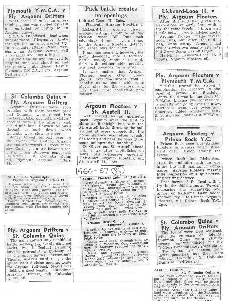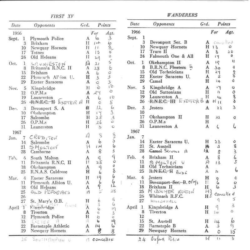 The Wanderers had a very good year, W24, L5, D2, beating most other club 2nd XVs – with the exception of Truro II and returning 5-8 and 14-6 v St Austell 1st XV. The Drifters W16, L8, D2, 271-179, but the Floaters won but 1, losing 13 and drawing 3, 38-209. The A Colts, despite heavy defeats at the hands of St Austell Colts, St Boniface College and Tiverton, emerged W17, L12, 300-244. John Williams, a massive forward, played regularly – and equally as regularly kicked goals – for the Devon Colts side. The B Colts W2, L8, D1, 28-130 and the Barbarians W6, L8, D1, 139-131, but both these sides tapered off early in March. The continued overcrowding in the dressing rooms, the result of so many sides, resulted in DHSOB seeking pastures new.