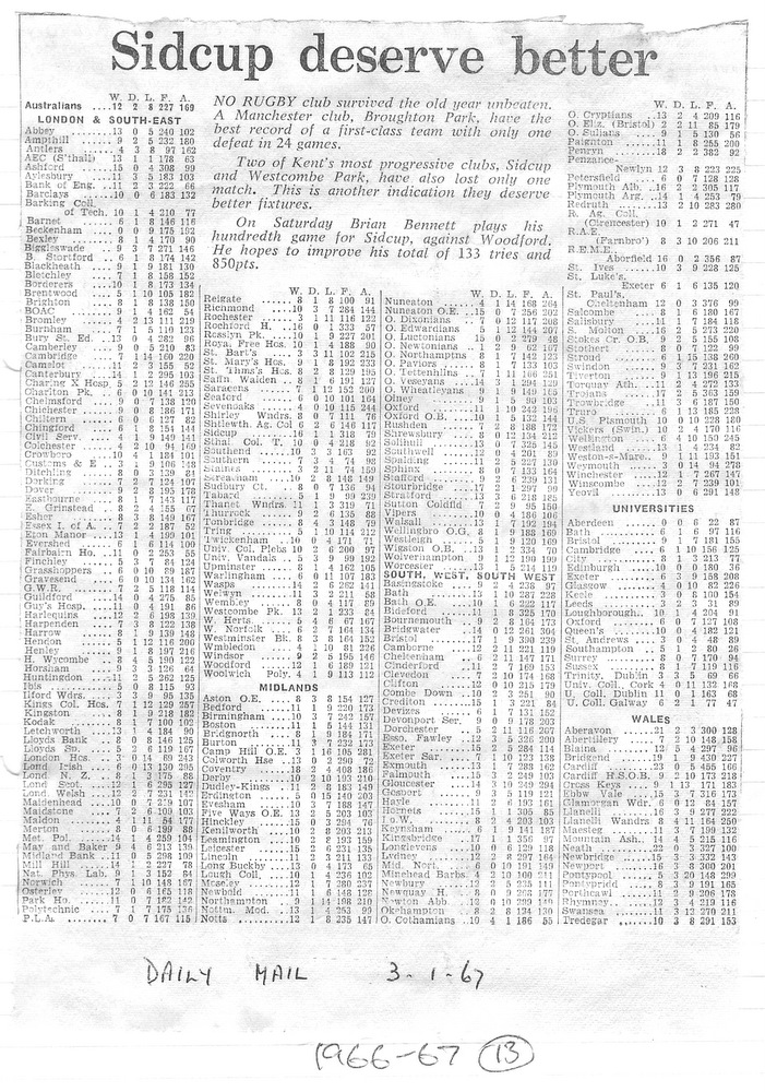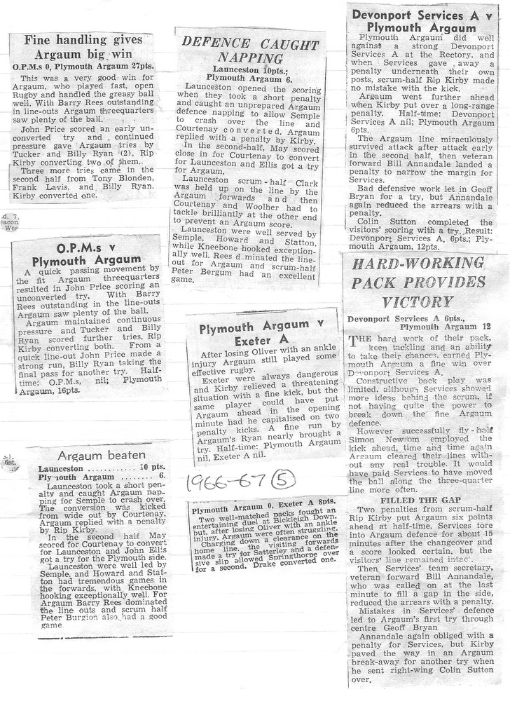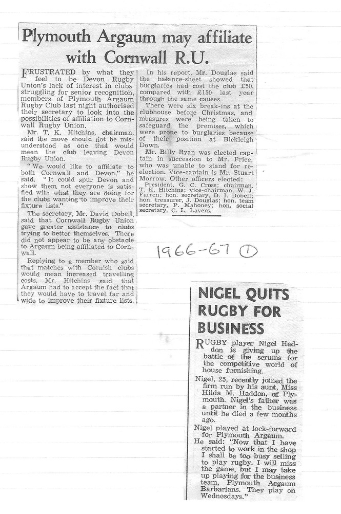 Billy Ryan, associated with the Club from his school days, a fast breaking, incisive, quick thinking stand off half took over the captaincy, whilst Rip Kirby returned from his Plymouth Albion excursion to operate the base of the scrum.