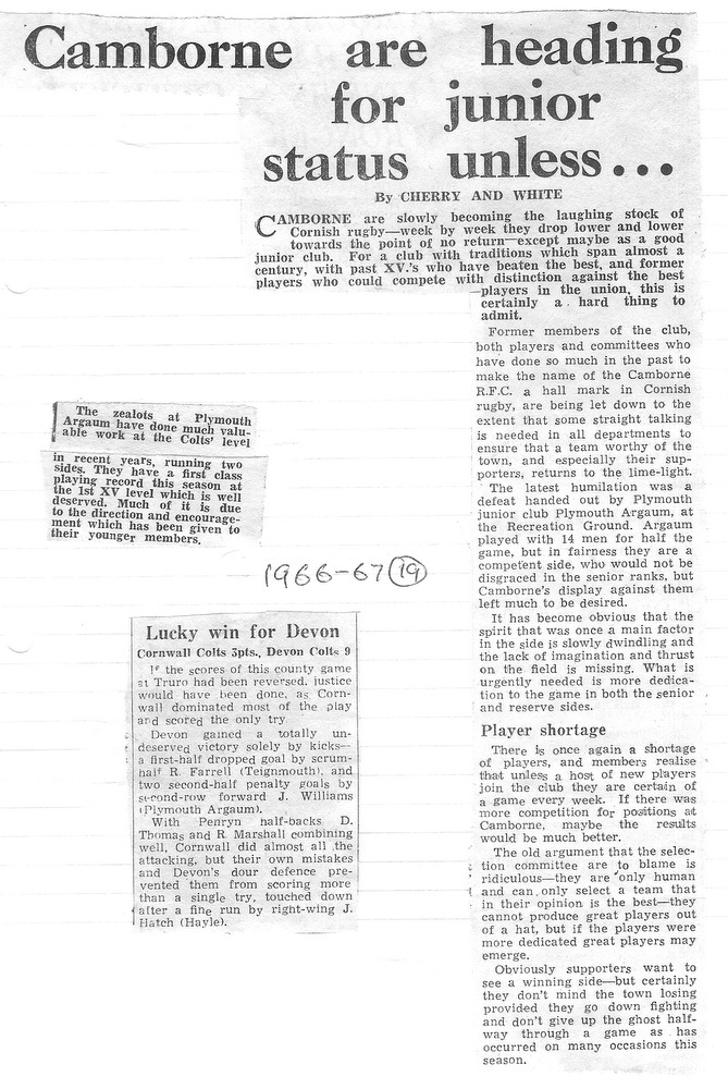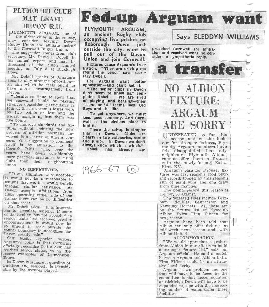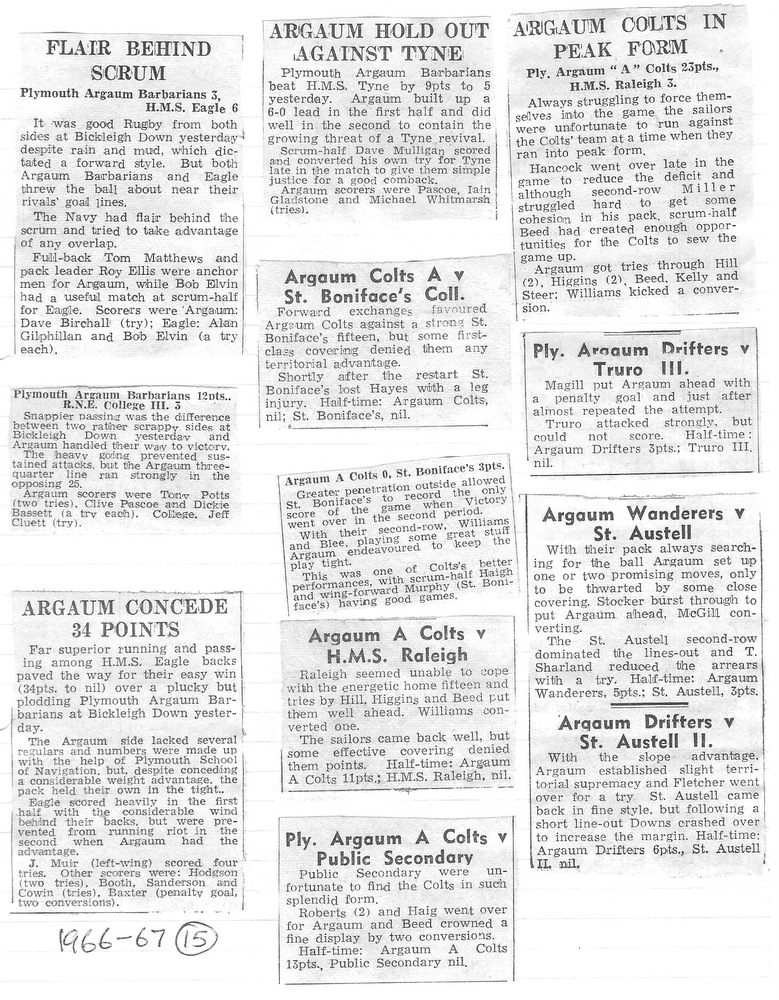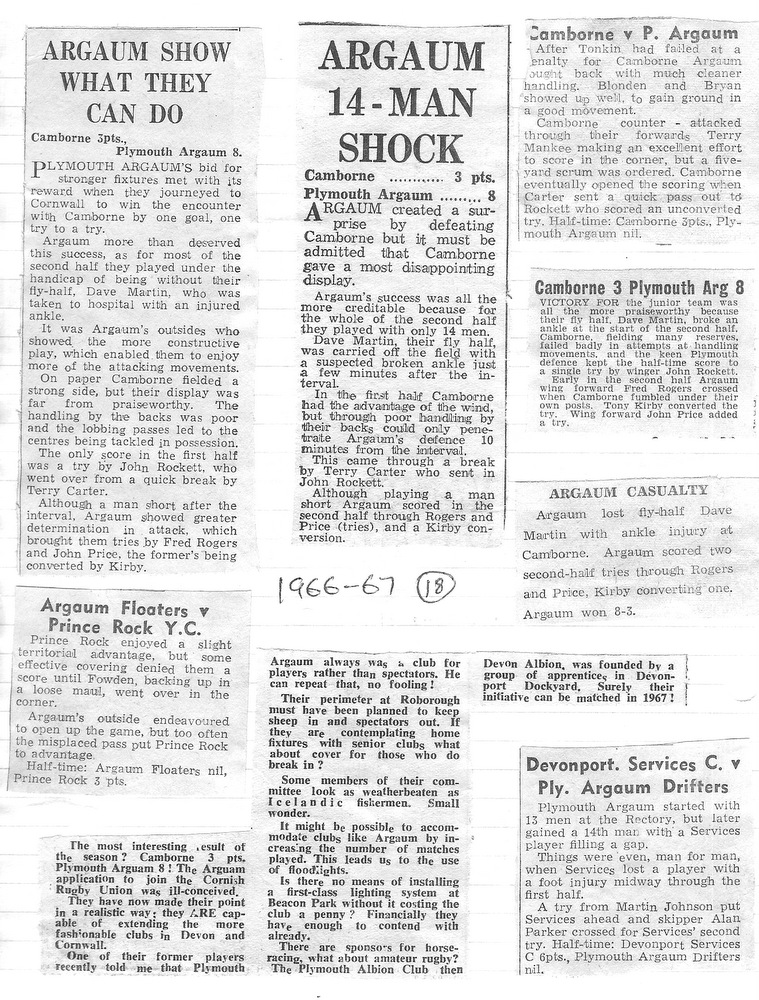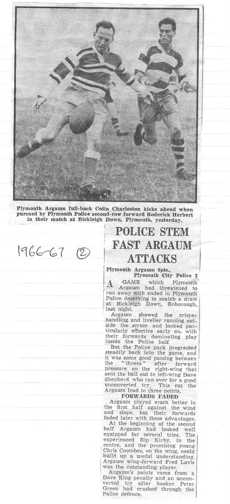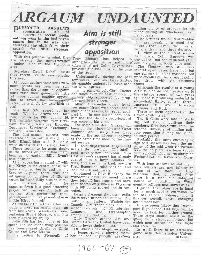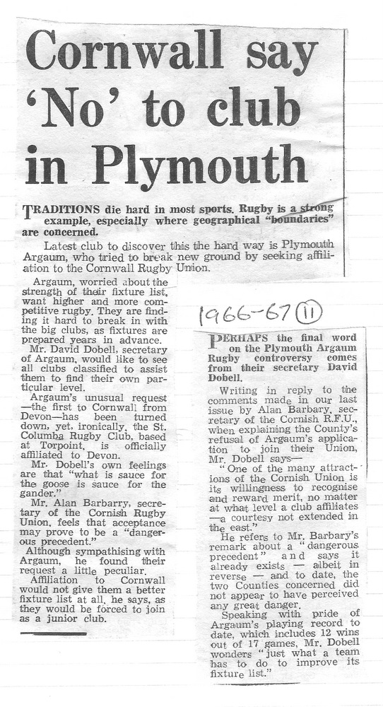 However, the crowning point of the season was the match against Camborne – at Camborne – when the Club against all expectations, defeated the home side’s 1st XV 8-3 and this despite losing one of the Club’s key players Dave martin at stand off with a broken ankle early in the second half. For some time the Club had been pressing for an opportunity to meet stronger opposition with, let it be said, no encouragement whatsoever from the Devon County Committee and a win such as this surely emphasised the Club’s potential. However, the Cornish press, whilst accepting Argaum’s superiority, suggested “Camborne are heading for junior status”. The tries were scored by wing forwards Fred Rogers and John Price, Kirby kicking a conversion.