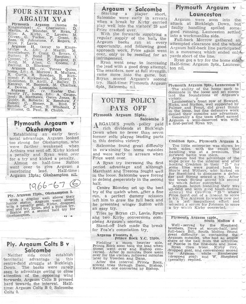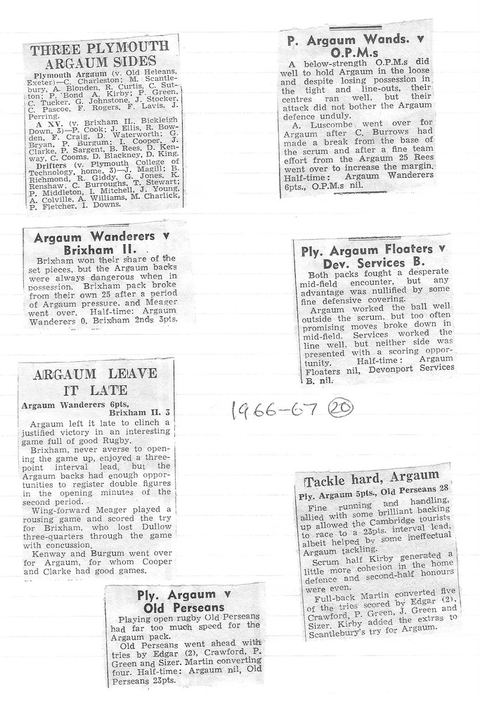 On the other side of the coin, a Cambridge touring side, Old Perseans, ironically under the management of a former Argaum member, gave the Club a lesson in the value of backing up and deservedly inflicted the heaviest defeat of the season 5-28 and this at Bickleigh Down. The final figures for the season, W22, L12, D5, 426-239.