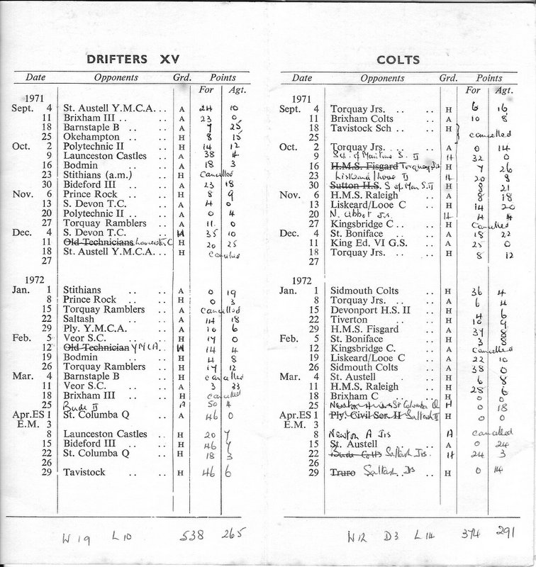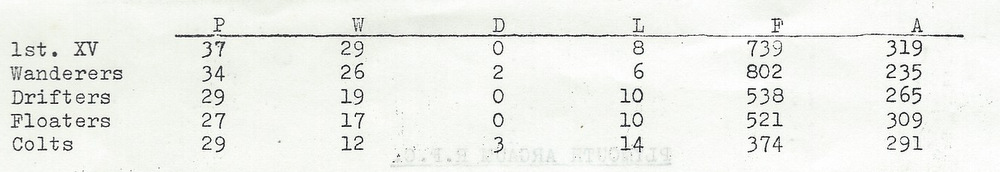 The Wanderers, restored to the bosom of the Plymouth and District Rugby Combination, reached the final of the Lockie Cup 16-6 v OPOs and 16-10 v Launceston A, to crash in the final against Plymouth Albion United in late April 0-27. In most of their matches, they indulged in some heavy scoring on their own account, as witness their final figures W26, L6, D2, 791-252. The Drifters, with John Ellis still enjoying his Indian summer, ran in 538-265 winning 19, losing 10, whilst the Floaters enjoyed an upsurge W17, L10, 521-305. The Colts, a shade disappointing, but still achieving a points surplus W12, L14, D3, 374-291.
