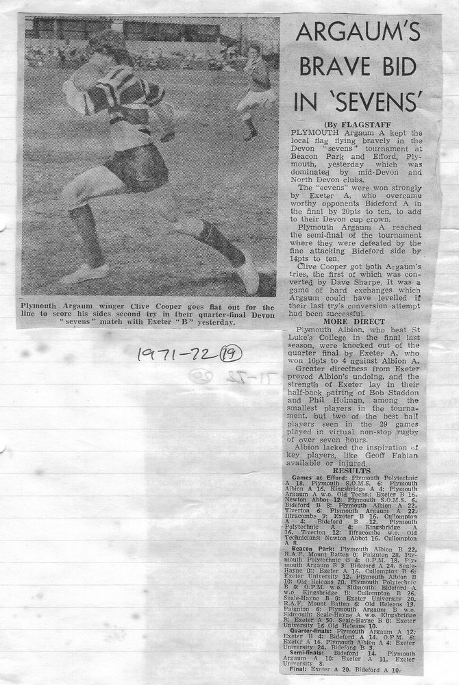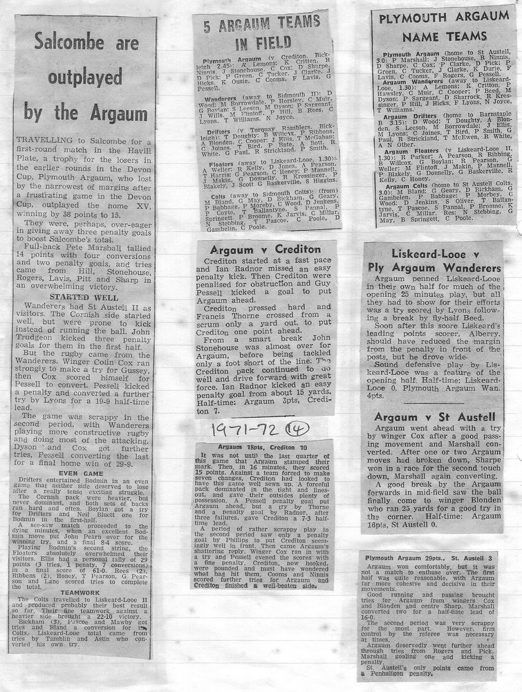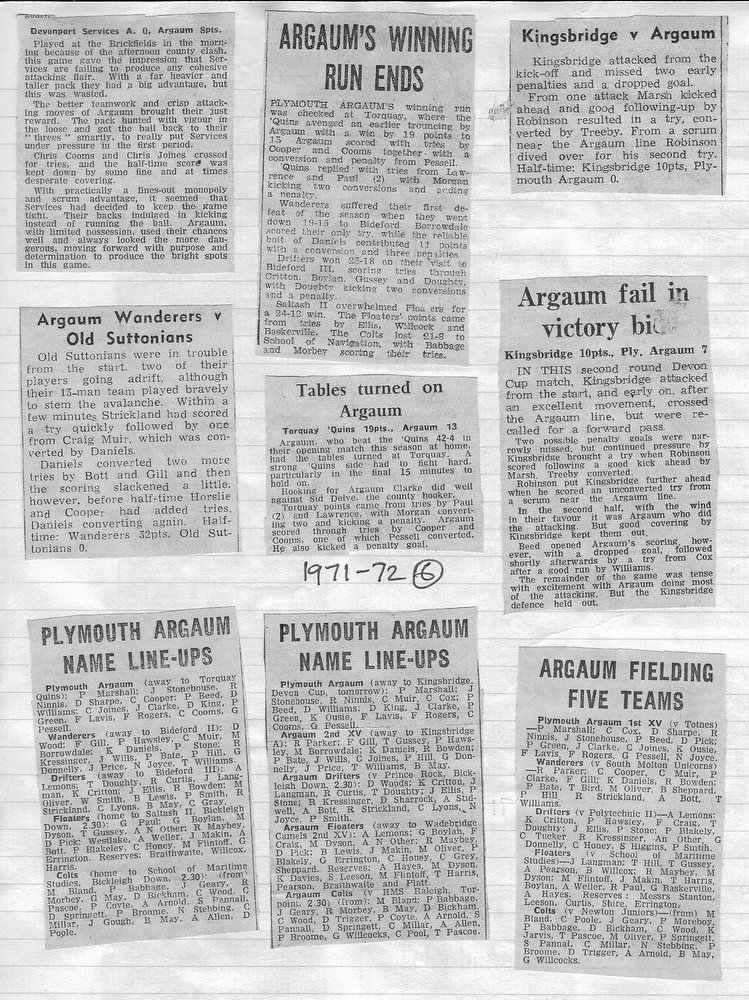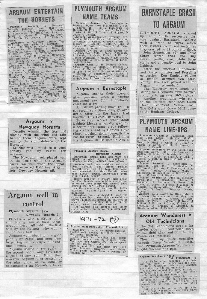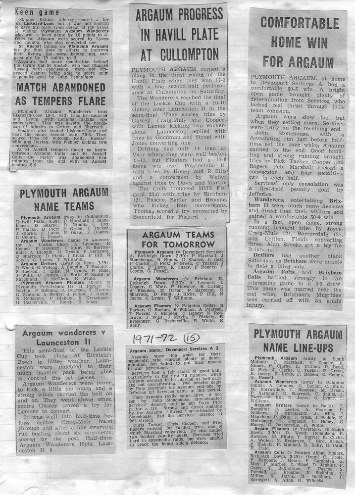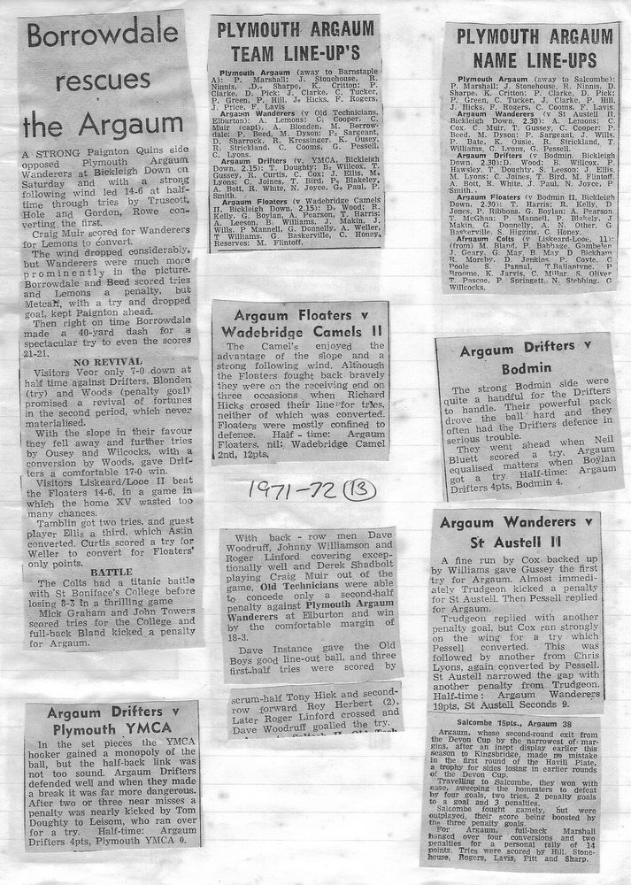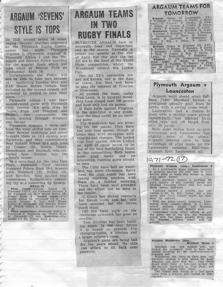 Additional Notes (R.Belli): The 1971-72 was another very successful season but the club missed out on chances to pick up silverware. With Barry Rees now in a coaching role and Frank Lavis back at skipper, The Chiefs beat Salcombe, Cullompton and Paignton on the road before narrowly succumbing to Ilfracombe in The Havill Plate Final in North Devon. The Wanderers lost only 6 of their 34 matches and after re-entering The Plymouth combination fold were pipped by Plymouth Albion United in The Lockie Cup final. On the sevens front, Argaum got to the semi-final stage of the Devon tournament whilst also hosting their own 11-team tournament at the end of the season. Geoff Geary played for the Devon Youth and Colts sides whilst D.Bickham also made the county squad.