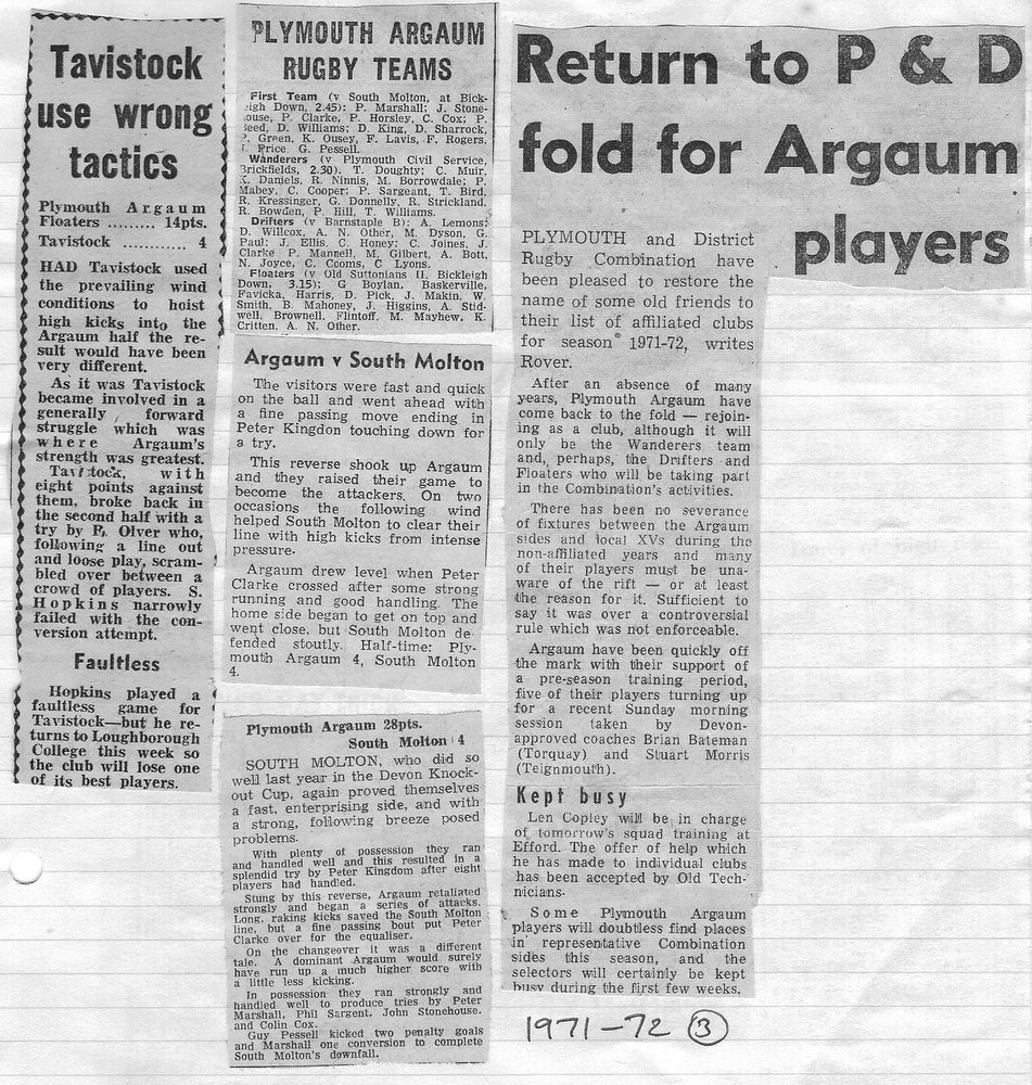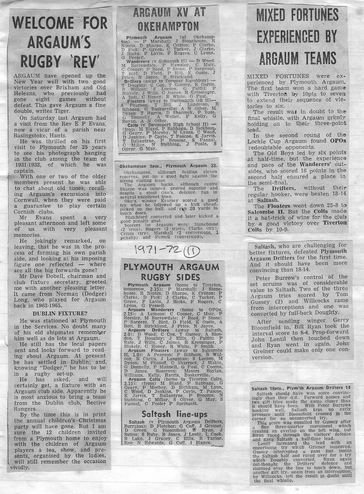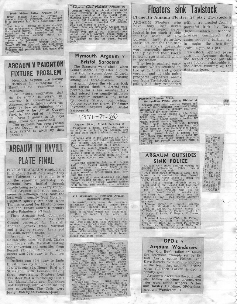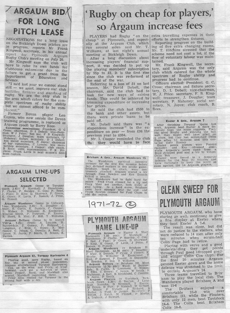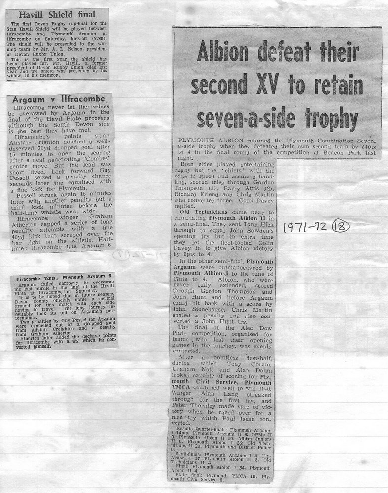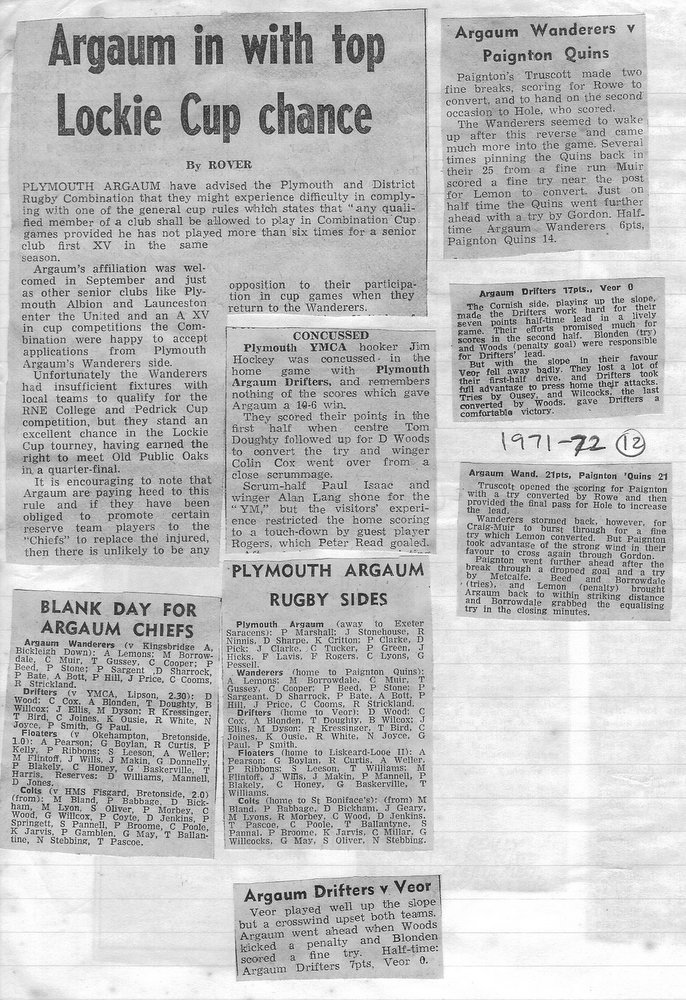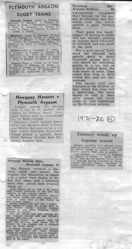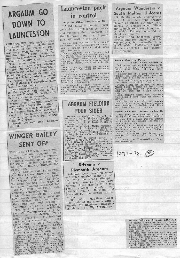 Additional Notes (R.Belli): The 1971-72 was another very successful season but the club missed out on chances to pick up silverware. With Barry Rees now in a coaching role and Frank Lavis back at skipper, The Chiefs beat Salcombe, Cullompton and Paignton on the road before narrowly succumbing to Ilfracombe in The Havill Plate Final in North Devon. The Wanderers lost only 6 of their 34 matches and after re-entering The Plymouth combination fold were pipped by Plymouth Albion United in The Lockie Cup final. On the sevens front, Argaum got to the semi-final stage of the Devon tournament whilst also hosting their own 11-team tournament at the end of the season. Geoff Geary played for the Devon Youth and Colts sides whilst D.Bickham also made the county squad.