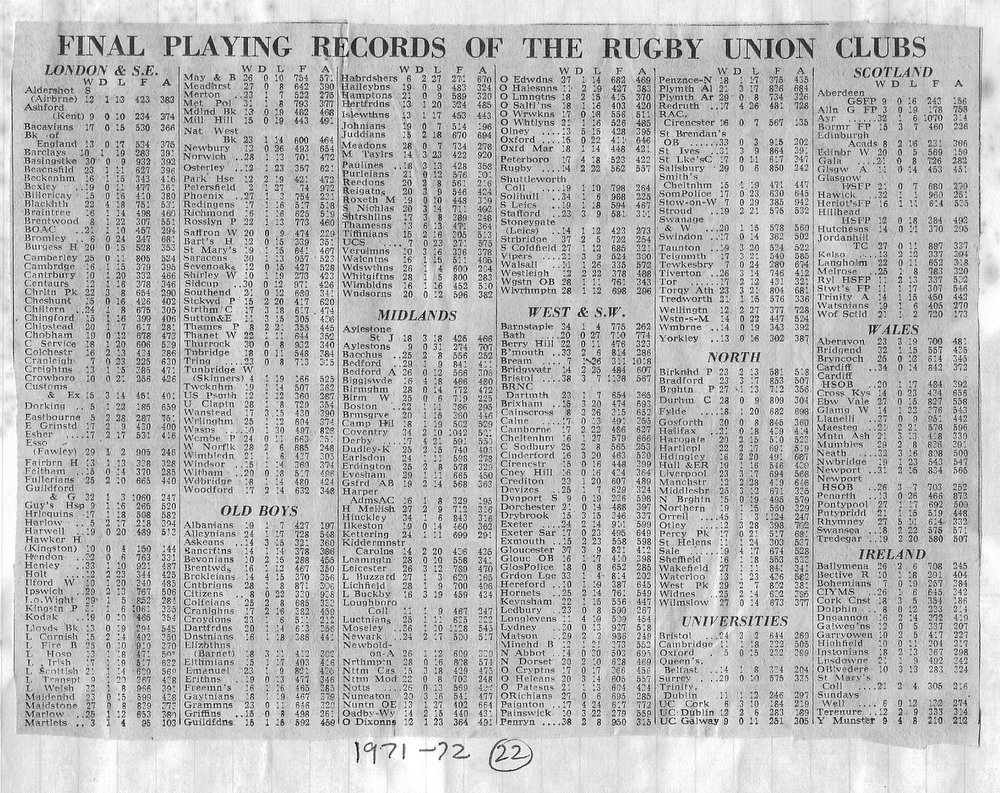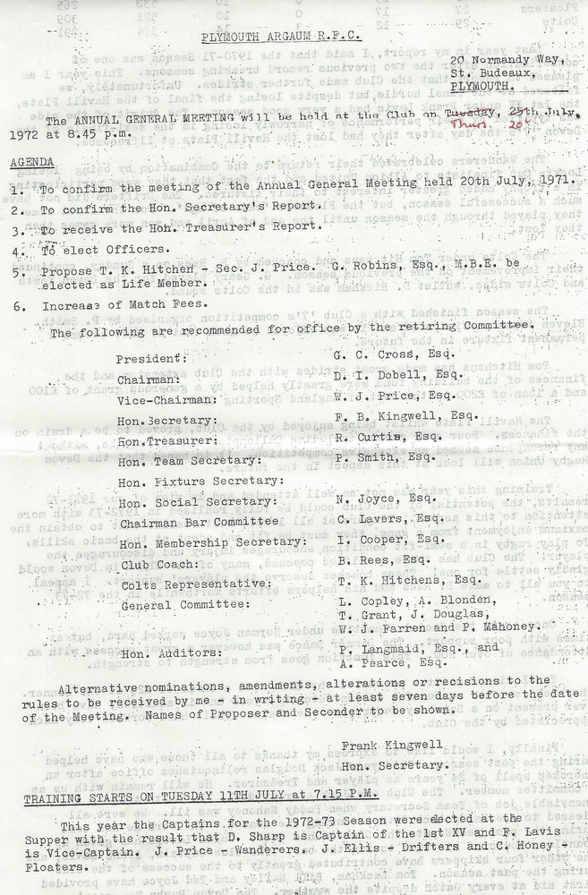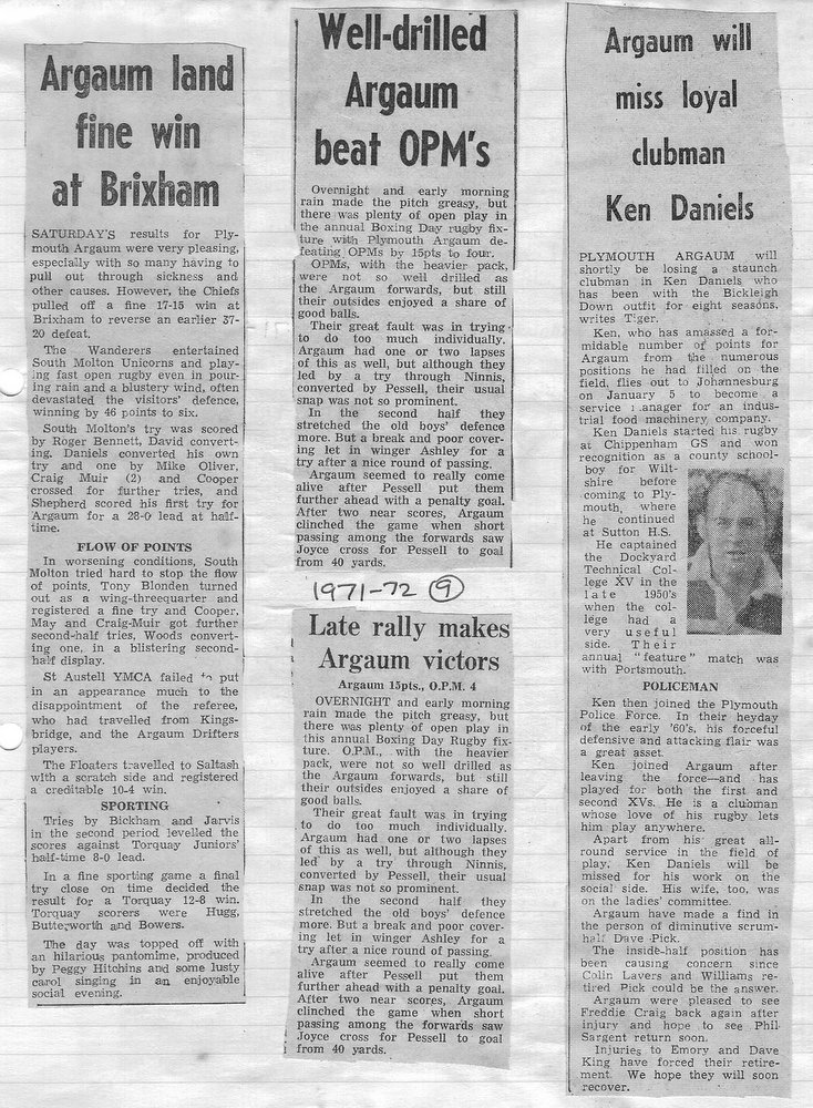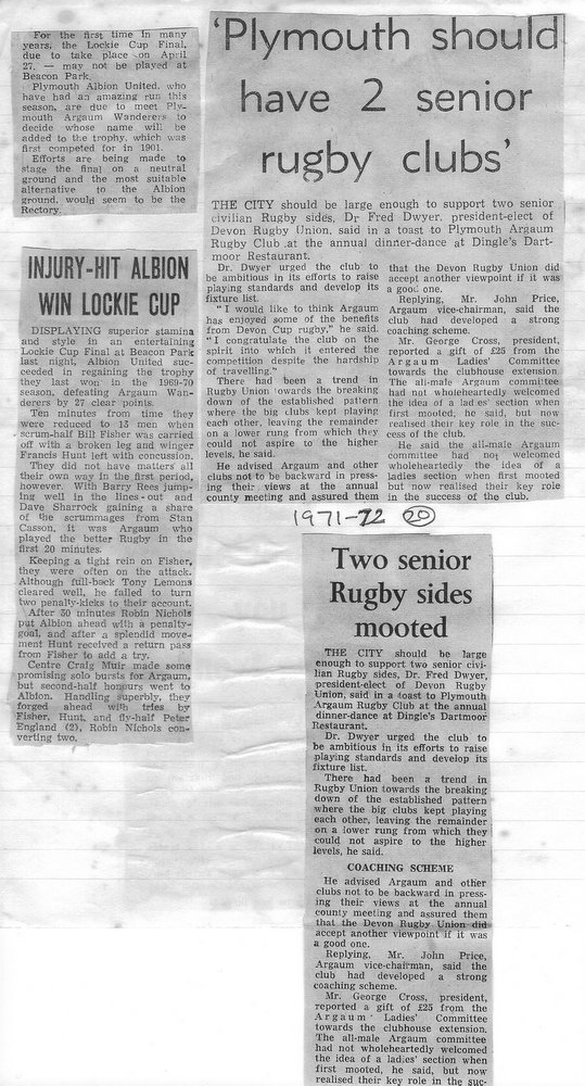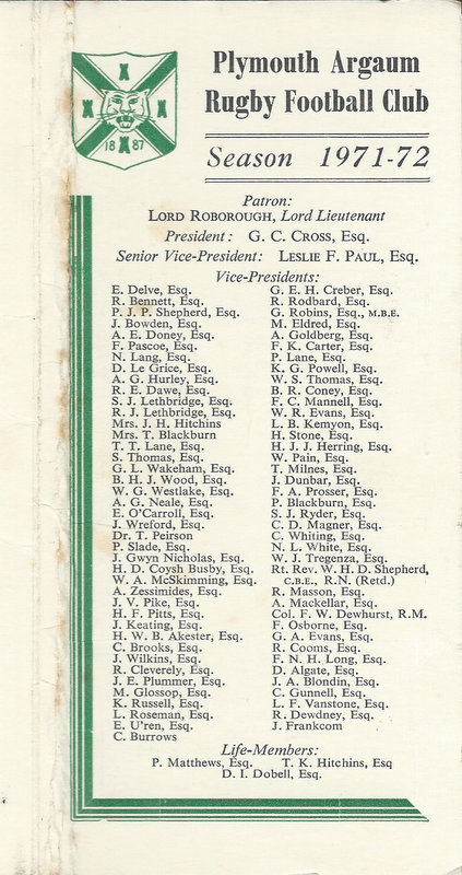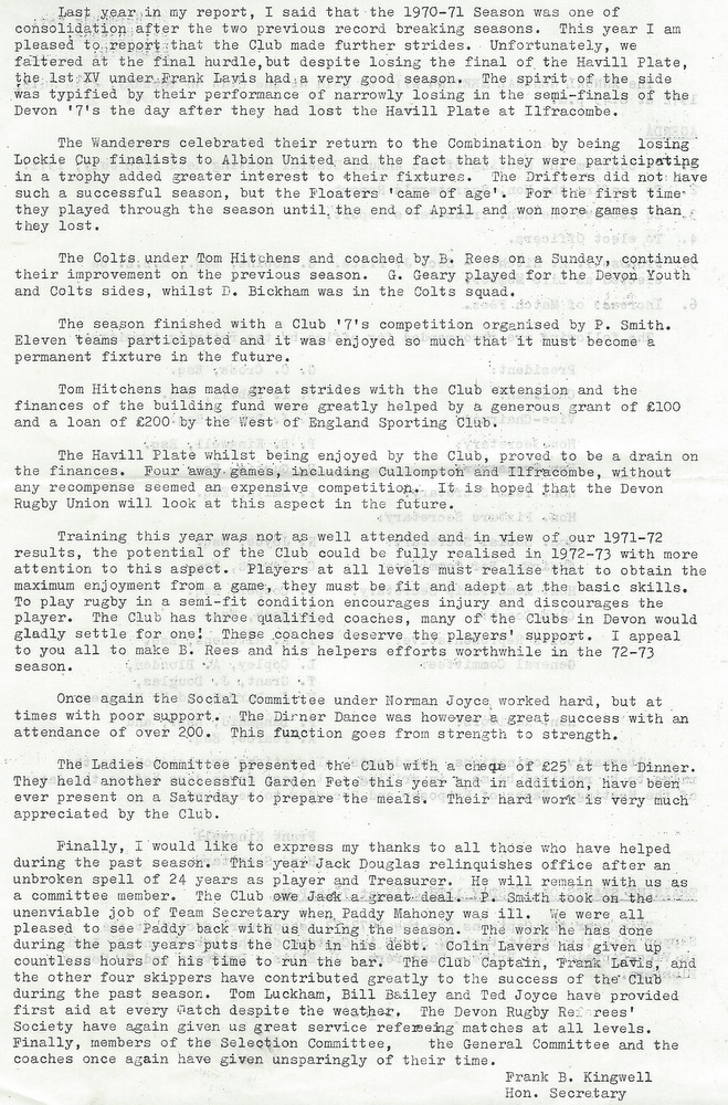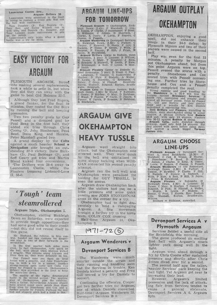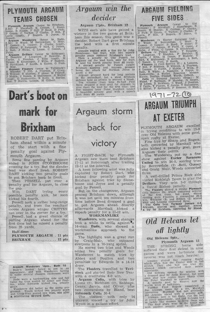 Additional Notes (R.Belli): The 1971-72 was another very successful season but the club missed out on chances to pick up silverware. With Barry Rees now in a coaching role and Frank Lavis back at skipper, The Chiefs beat Salcombe, Cullompton and Paignton on the road before narrowly succumbing to Ilfracombe in The Havill Plate Final in North Devon. The Wanderers lost only 6 of their 34 matches and after re-entering The Plymouth combination fold were pipped by Plymouth Albion United in The Lockie Cup final. On the sevens front, Argaum got to the semi-final stage of the Devon tournament whilst also hosting their own 11-team tournament at the end of the season. Geoff Geary played for the Devon Youth and Colts sides whilst D.Bickham also made the county squad.