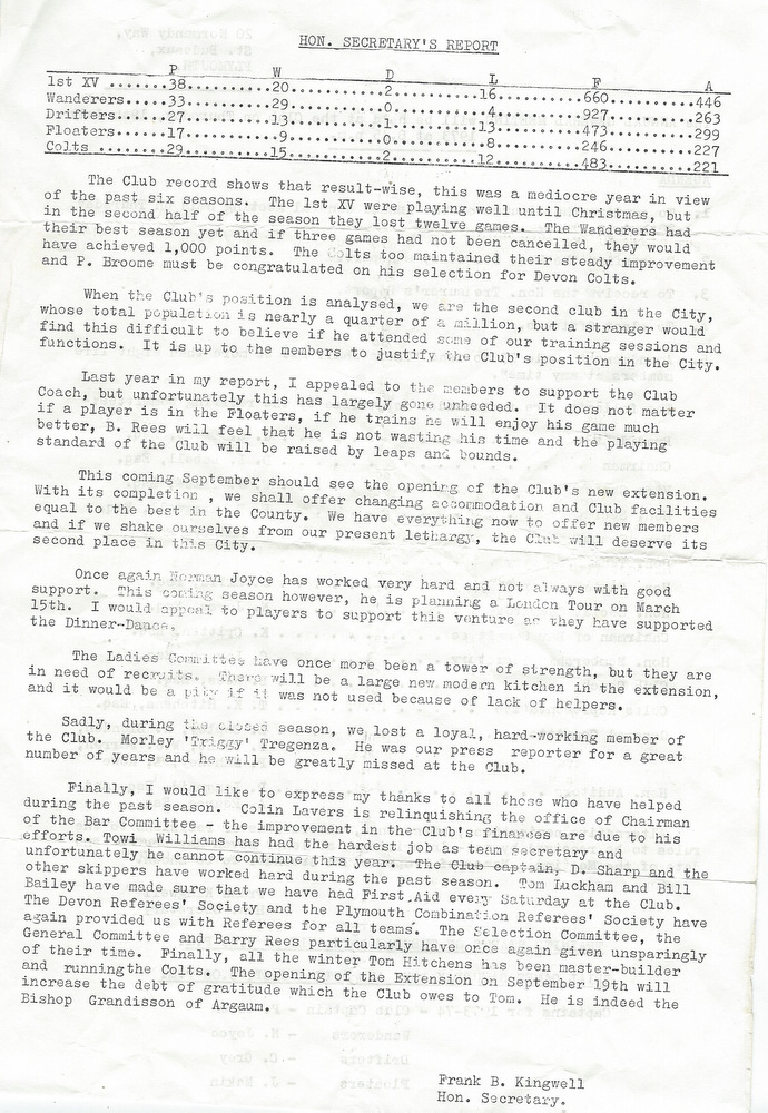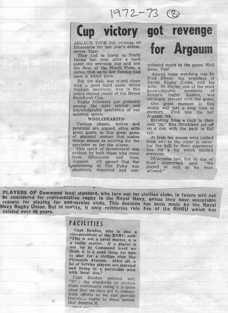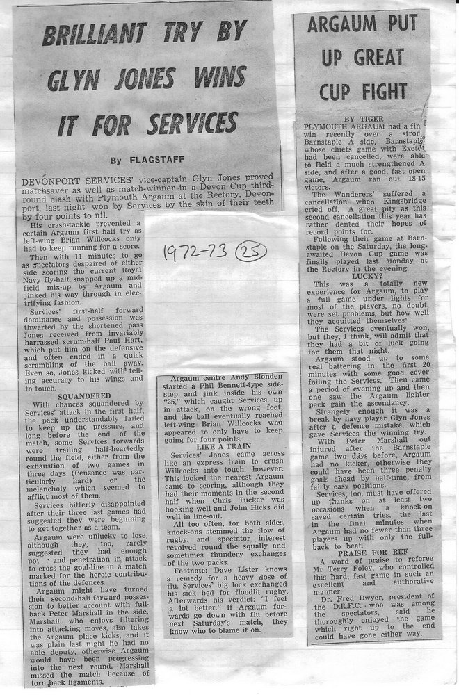 In the Devon Cup they romped home in the first round at Honiton by a margin of 57-3, in the next round at home they avenged the previous years Havill Plate final, by defeating Ilfracombe 18-10 (tries by Gray 2, Critten, Baskerville plus a Marshall conversion) to be drawn away in the next round to Devonport Services where, at the Rectory, the navy side once again put paid to further progress by a Glyn Jones try – the only score – 11 minutes from the end.
