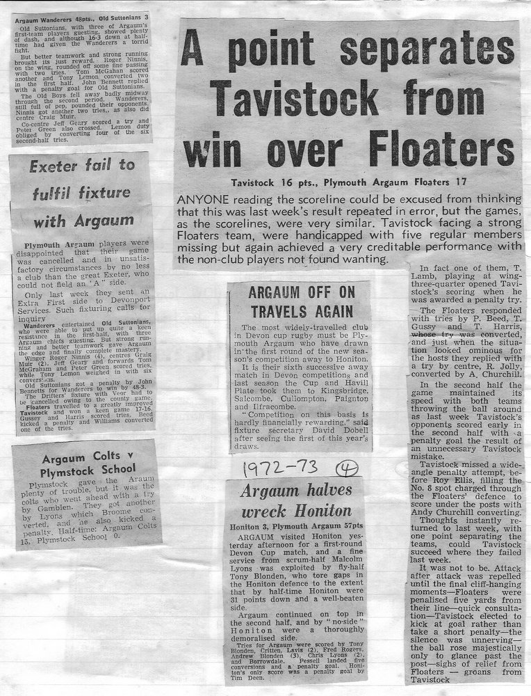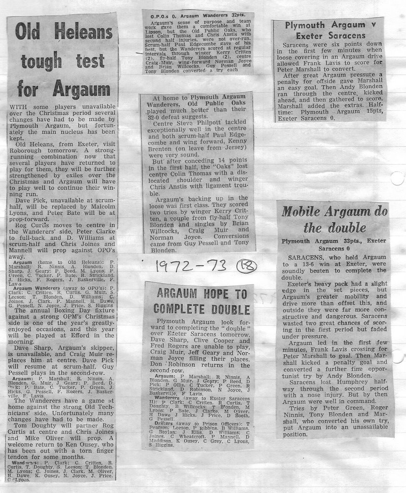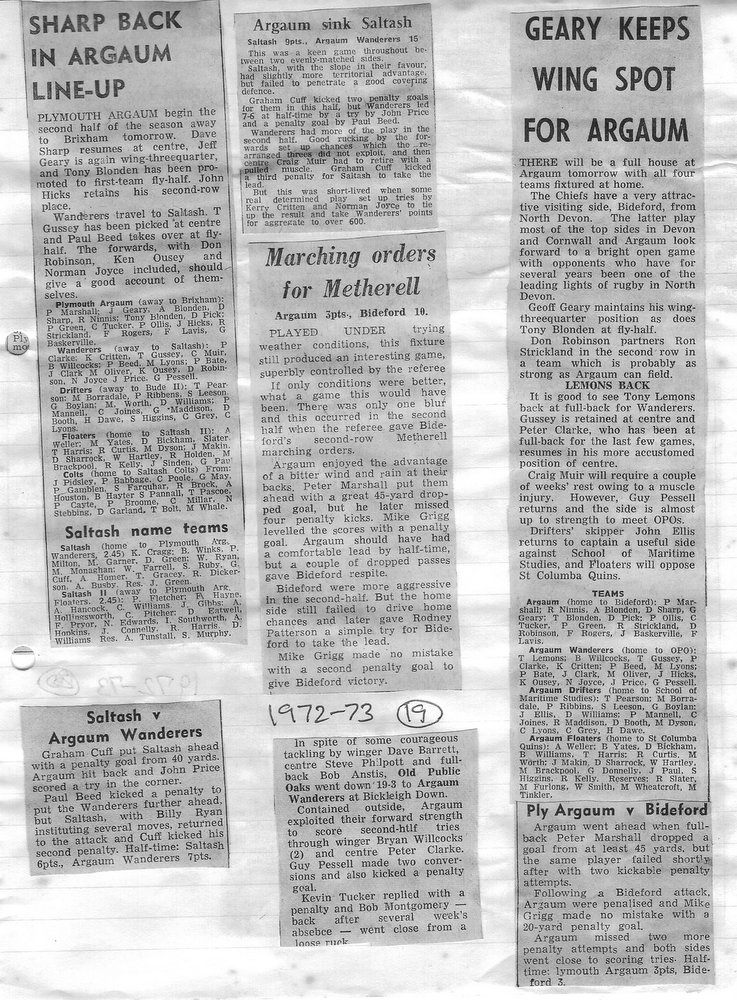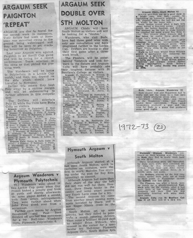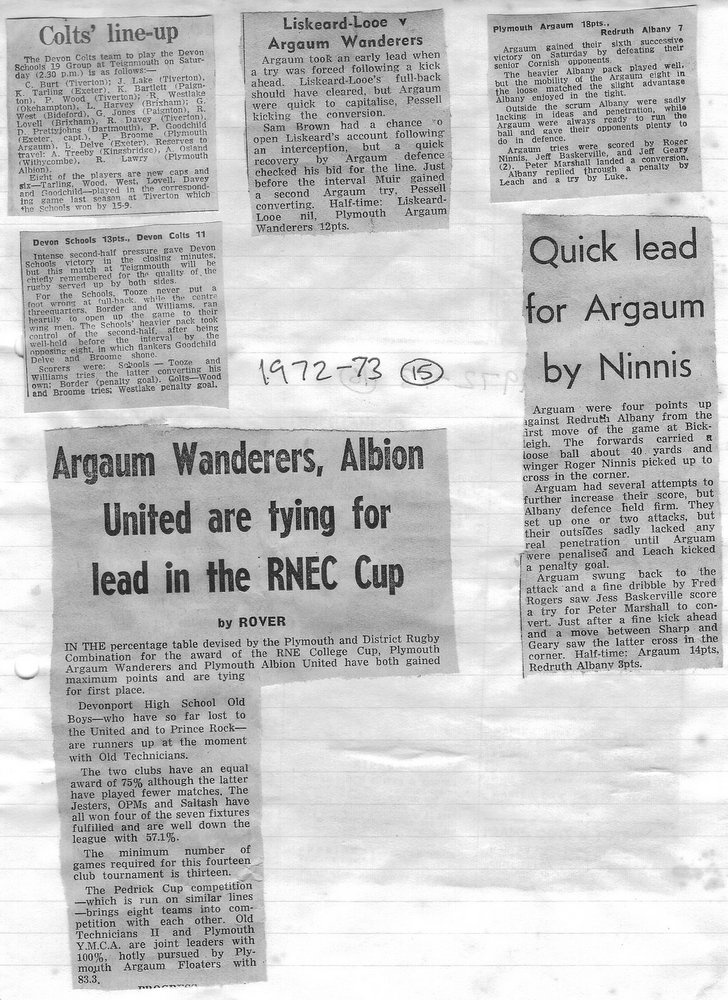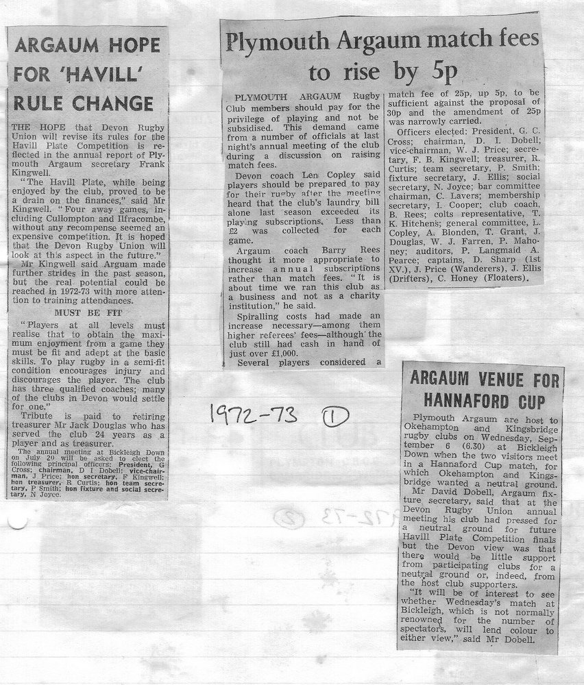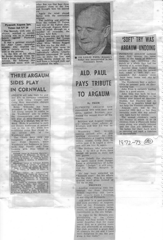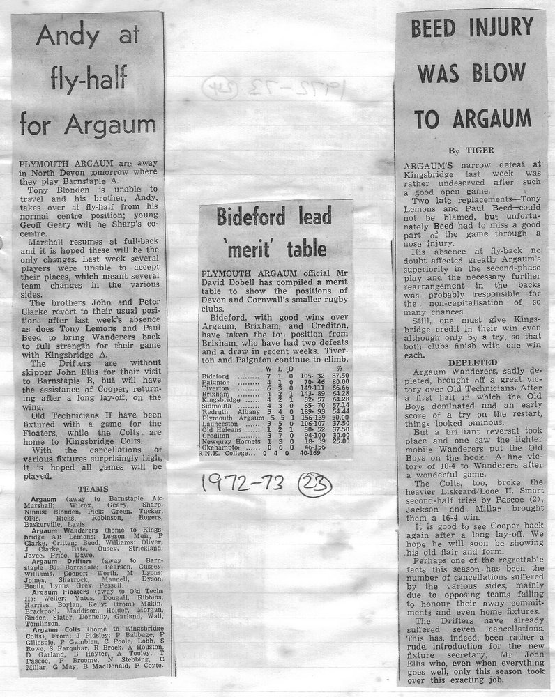 Additional Notes (Rich Belli): In 1972-73 The Chiefs, led by Dave Sharp, had a storming start to the season but tailed off in the second half, their expansive style costing them on occasions. Good wins in the first two rounds of the Devon Cup, including revenge over Ilfracombe, saw another meeting with Devonport Services A at The Rectory. The result was even closer than 1969-70 with the home side prevailing by a single try, now worth 4 points. The Wanderers, under John Price, played a similarly adventurous game and it paid off. Only 4 defeats all season for a side that was close to topping 1000 points. The other 3 sides all had even seasons. Peter Broome was selected for Devon Colts against Royal Navy Under 19s at Yoevilton. Chairman David Dobell, ahead of his time, was calling for organised leagues to be established and even produced an unofficial Merit Table of his own. Sadly, Mr WIlliam ‘Monty’ Tregenza, responsible for much of Argaum’s press under the pseudonym ‘Tiger’ over man years, passed away at the end of the season.