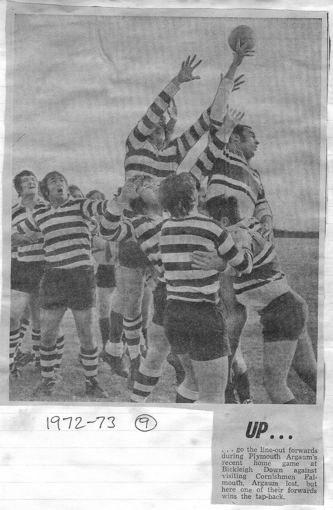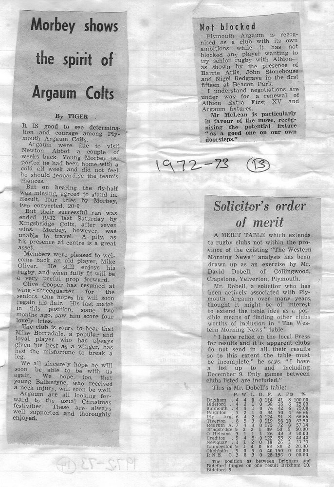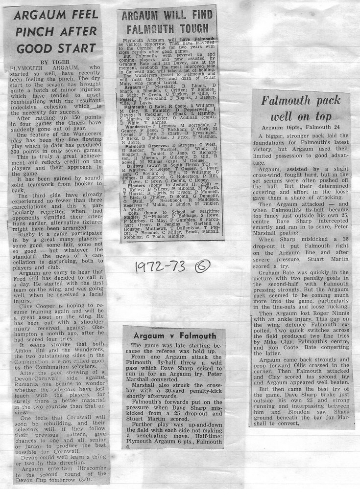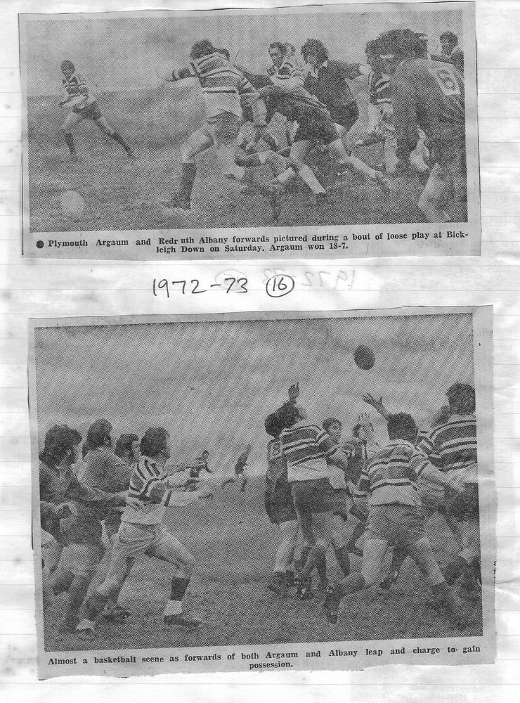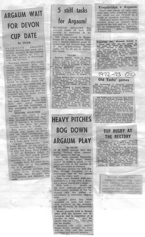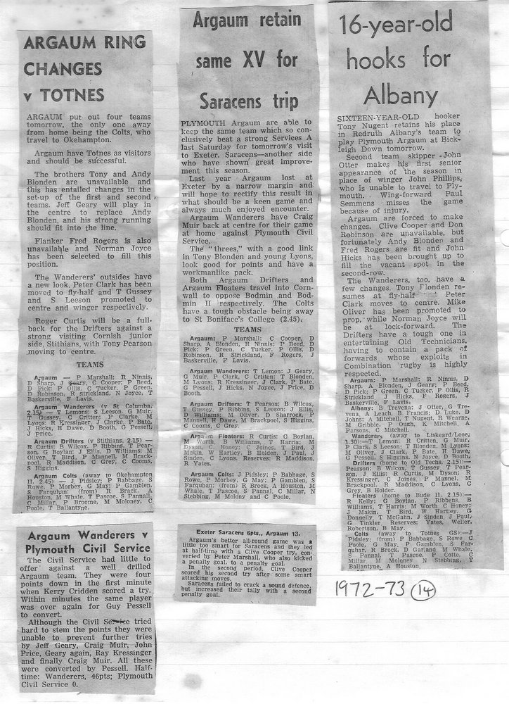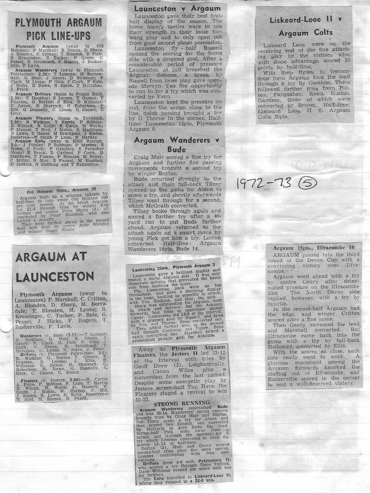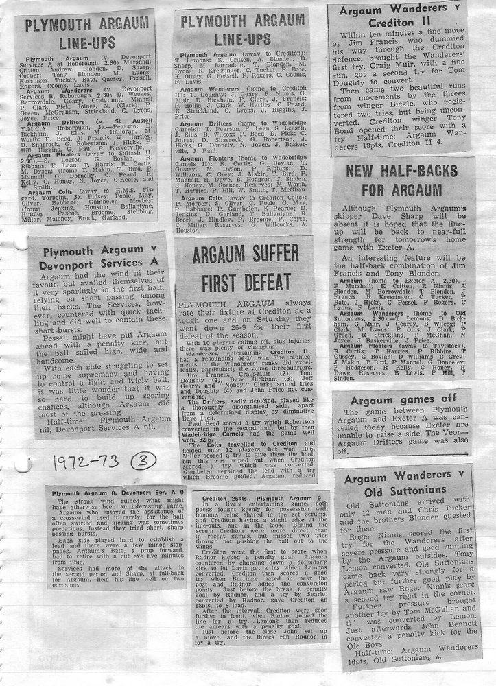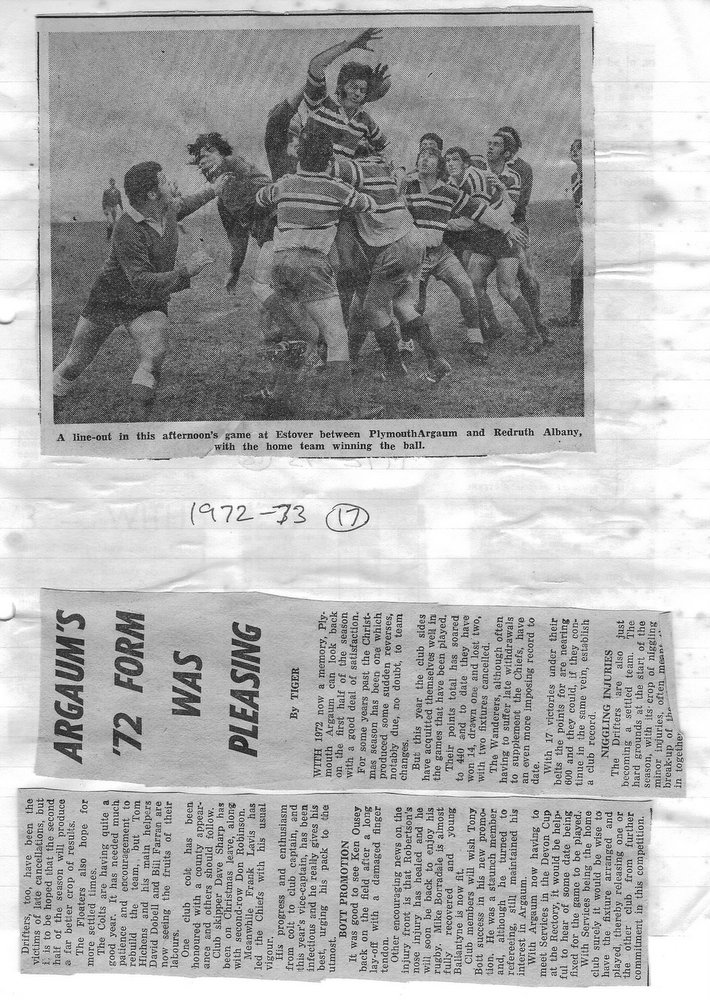 Additional Notes (Rich Belli): In 1972-73 The Chiefs, led by Dave Sharp, had a storming start to the season but tailed off in the second half, their expansive style costing them on occasions. Good wins in the first two rounds of the Devon Cup, including revenge over Ilfracombe, saw another meeting with Devonport Services A at The Rectory. The result was even closer than 1969-70 with the home side prevailing by a single try, now worth 4 points. The Wanderers, under John Price, played a similarly adventurous game and it paid off. Only 4 defeats all season for a side that was close to topping 1000 points. The other 3 sides all had even seasons. Peter Broome was selected for Devon Colts against Royal Navy Under 19s at Yoevilton. Chairman David Dobell, ahead of his time, was calling for organised leagues to be established and even produced an unofficial Merit Table of his own. Sadly, Mr WIlliam ‘Monty’ Tregenza, responsible for much of Argaum’s press under the pseudonym ‘Tiger’ over man years, passed away at the end of the season.