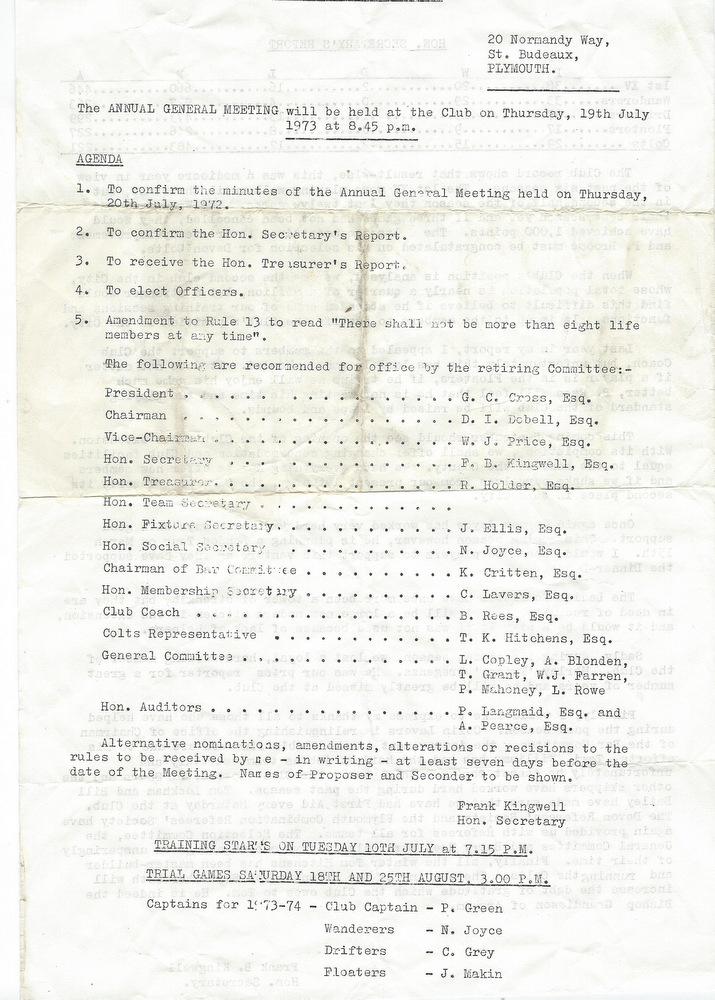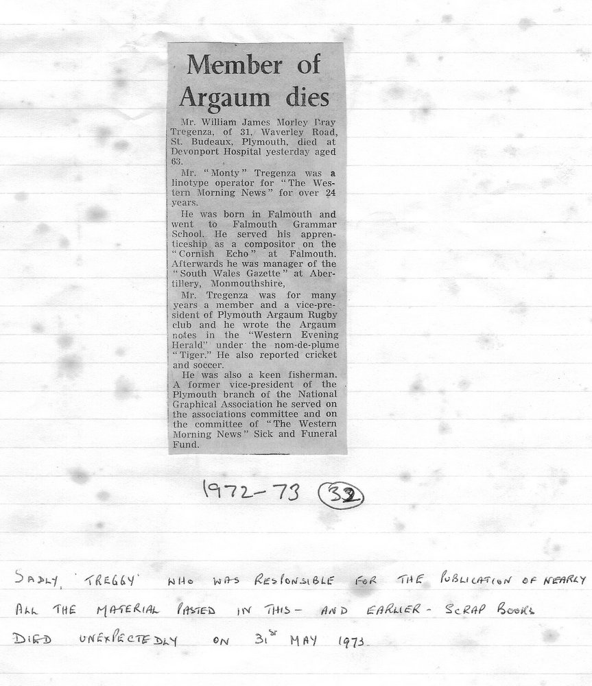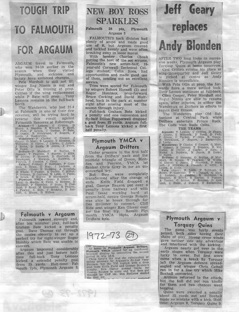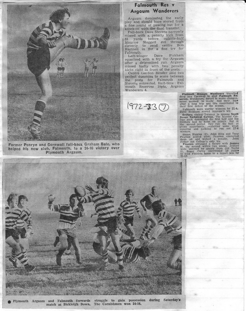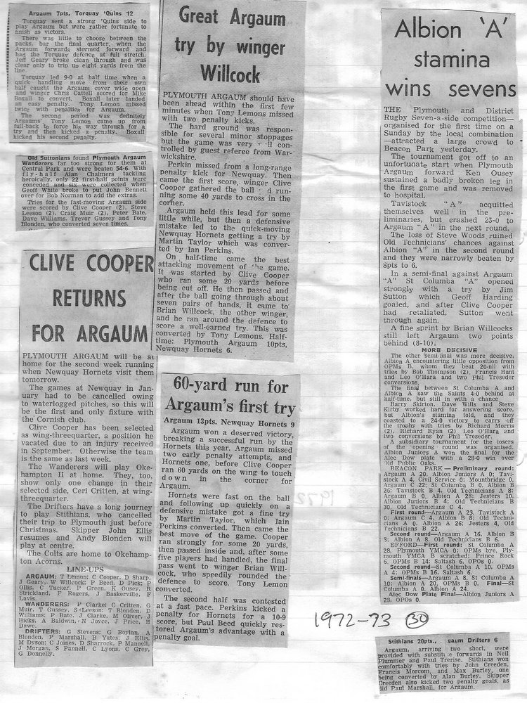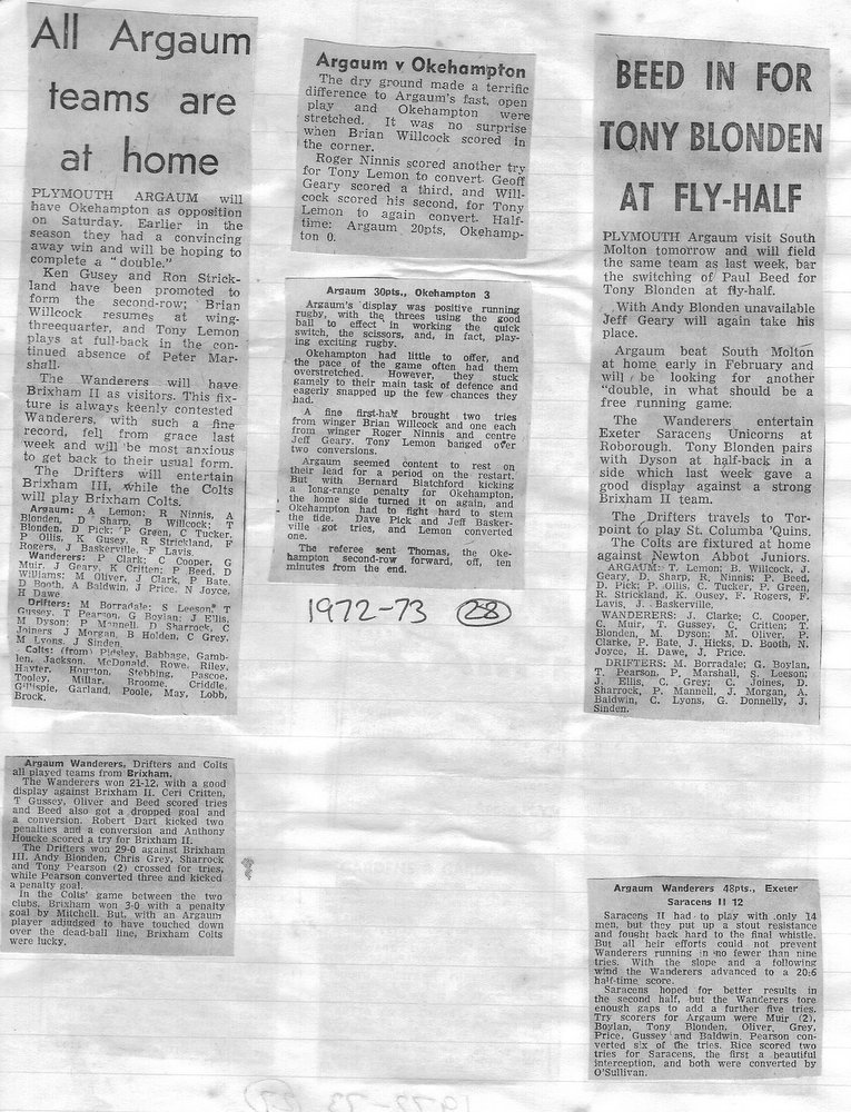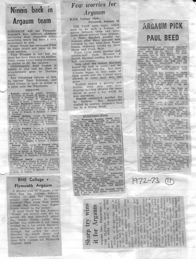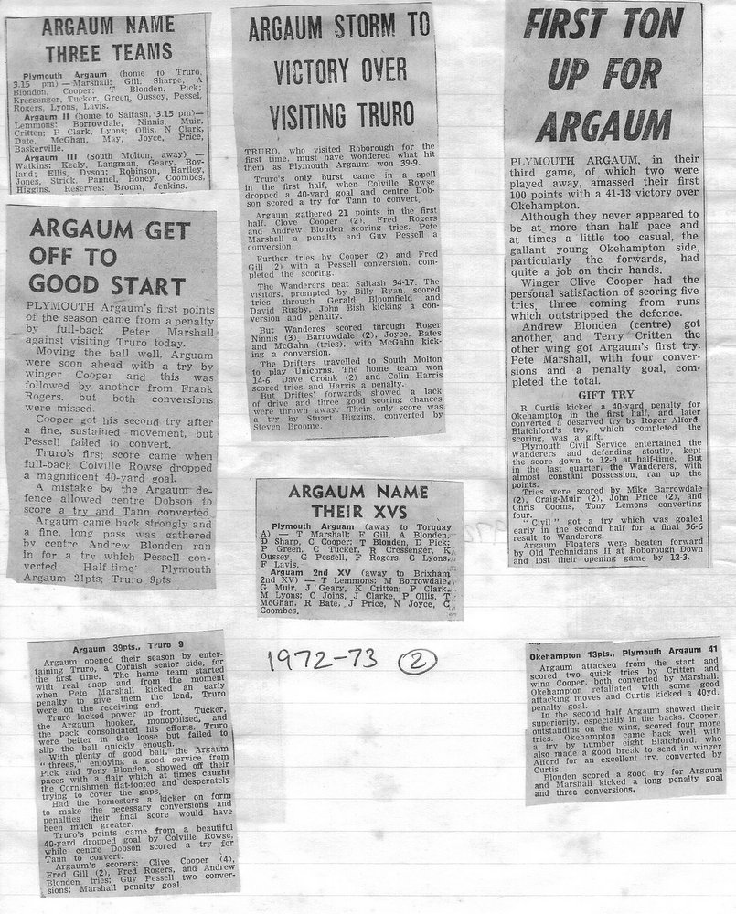 Additional Notes (Rich Belli): In 1972-73 The Chiefs, led by Dave Sharp, had a storming start to the season but tailed off in the second half, their expansive style costing them on occasions. Good wins in the first two rounds of the Devon Cup, including revenge over Ilfracombe, saw another meeting with Devonport Services A at The Rectory. The result was even closer than 1969-70 with the home side prevailing by a single try, now worth 4 points. The Wanderers, under John Price, played a similarly adventurous game and it paid off. Only 4 defeats all season for a side that was close to topping 1000 points. The other 3 sides all had even seasons. Peter Broome was selected for Devon Colts against Royal Navy Under 19s at Yoevilton. Chairman David Dobell, ahead of his time, was calling for organised leagues to be established and even produced an unofficial Merit Table of his own. Sadly, Mr WIlliam ‘Monty’ Tregenza, responsible for much of Argaum’s press under the pseudonym ‘Tiger’ over man years, passed away at the end of the season.