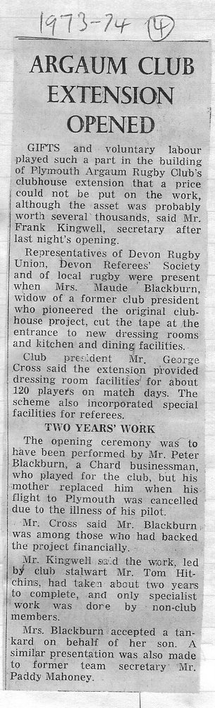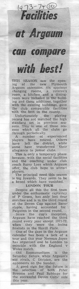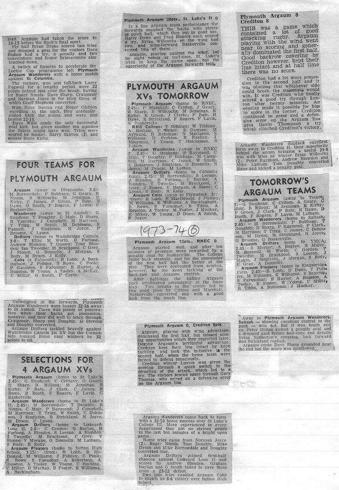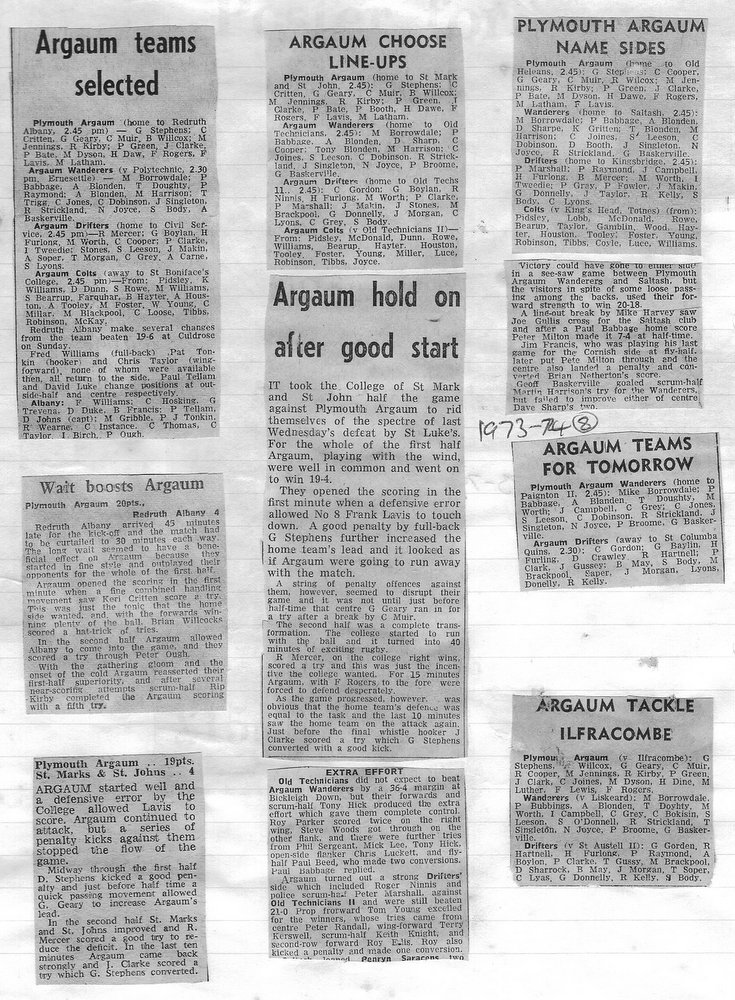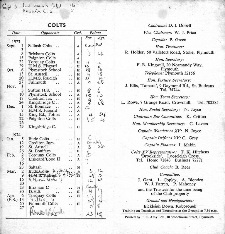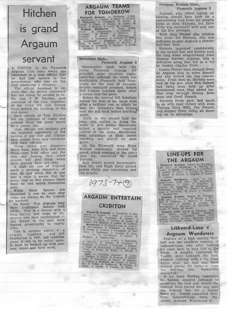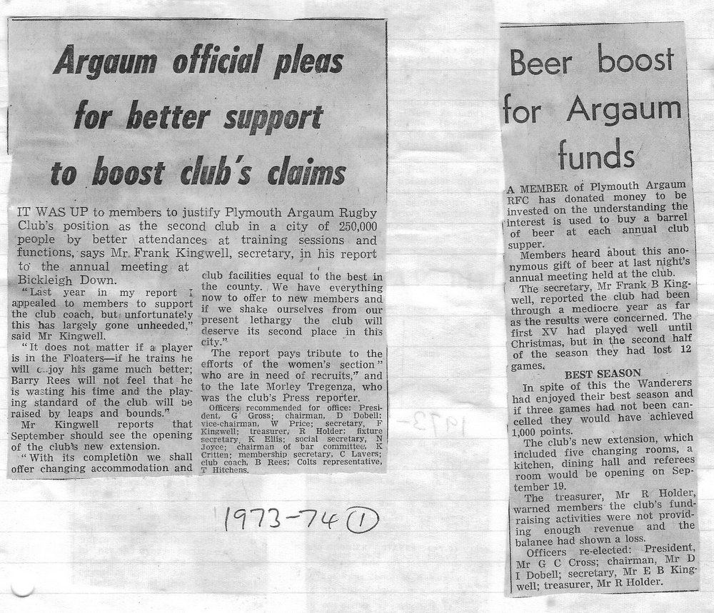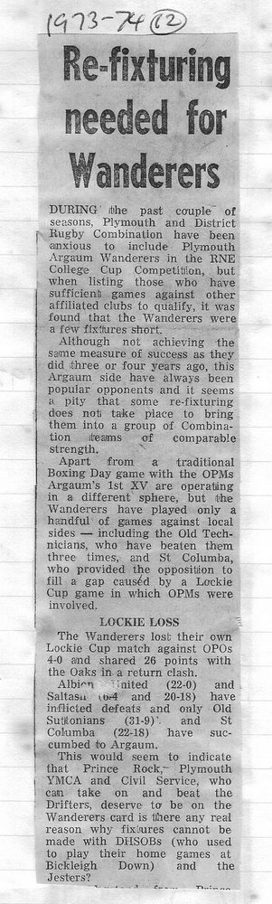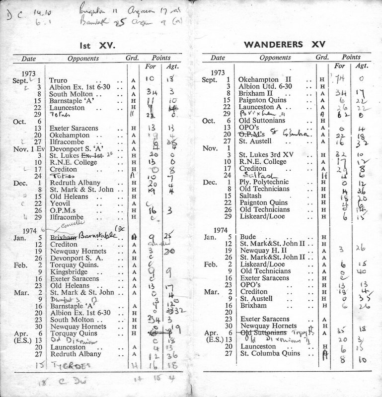 Additional Notes (R.Belli): 1973-74 saw significant developments off the field with an extension to the clubhouse (featuring five changing rooms, a kitchen, dining hall and refs room) officially opened in September. In a bid to increase club funds, a 200 club was established by Norman Joyce. He was also the organiser of a tour to London to coincide with the England v Wales Five Nations Match at Twickenham, tour opponents were Old Emmanuelians and old friends the Met Police C Division. On the playing front The Chiefs, with skipper Peter Green and The Wanderers led by Joyce had fairly even playing records; In the Devon Cup the Chiefs beat Paignton in their centenary season before succumbing to Barnstaple in the next round. The club also reached the semi-finals of The Combination Sevens being knocked out by OPMs. The Drifters were a little down on previous seasons and The Floaters only fulfilled one fixture. Tom Hitchins ran the colts for whom Peter Broome (for the second season) and Paul Babbage represented the County.