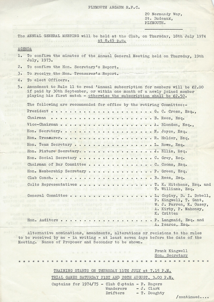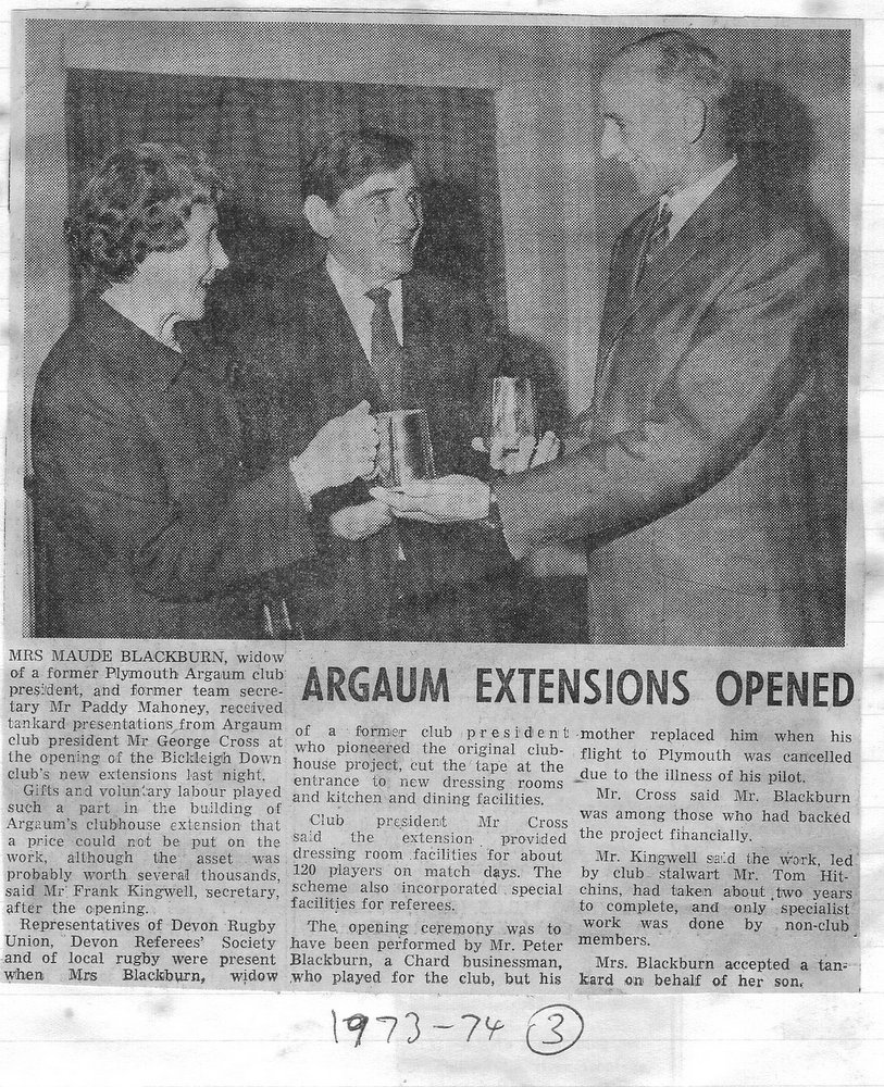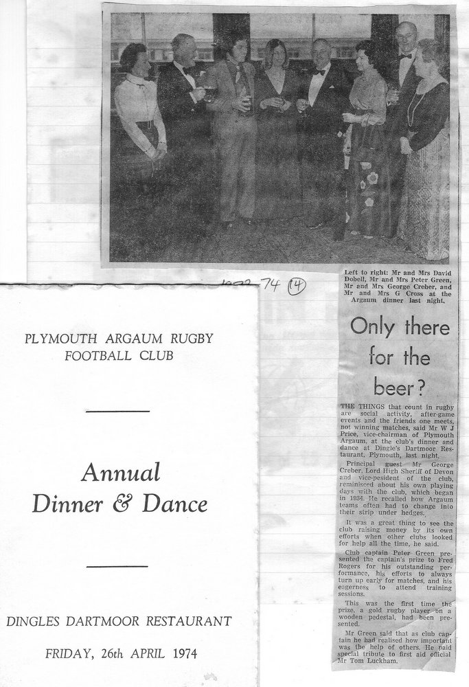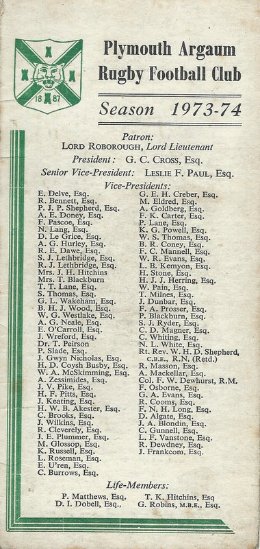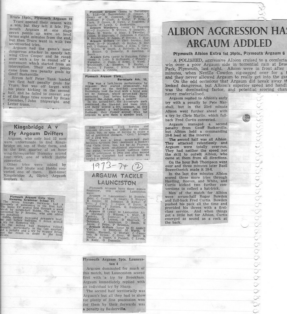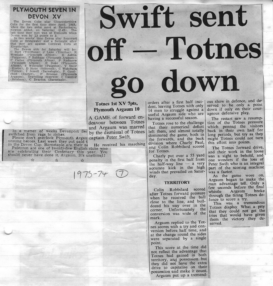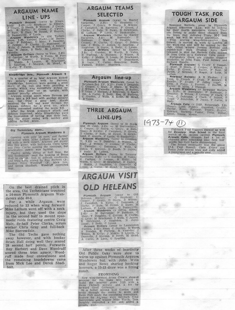 Additional Notes (R.Belli): 1973-74 saw significant developments off the field with an extension to the clubhouse (featuring five changing rooms, a kitchen, dining hall and refs room) officially opened in September. In a bid to increase club funds, a 200 club was established by Norman Joyce. He was also the organiser of a tour to London to coincide with the England v Wales Five Nations Match at Twickenham, tour opponents were Old Emmanuelians and old friends the Met Police C Division. On the playing front The Chiefs, with skipper Peter Green and The Wanderers led by Joyce had fairly even playing records; In the Devon Cup the Chiefs beat Paignton in their centenary season before succumbing to Barnstaple in the next round. The club also reached the semi-finals of The Combination Sevens being knocked out by OPMs. The Drifters were a little down on previous seasons and The Floaters only fulfilled one fixture. Tom Hitchins ran the colts for whom Peter Broome (for the second season) and Paul Babbage represented the County.
