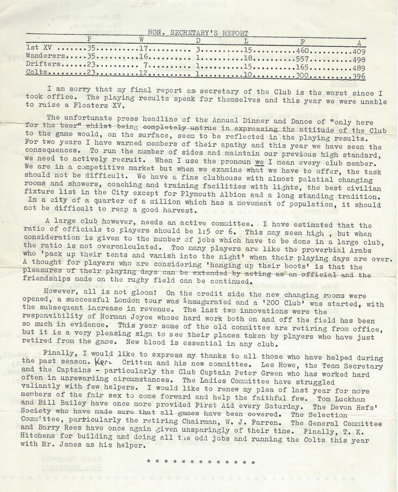 The Wanderers managed 16 wins, a draw and 18 defeats, 557-498. The Drifters had little success W7, D1, L15, 163-489. In the Devon Cup the club disposed of Paignton at Paignton 17-11, but went out at Barnstaple in the next round 9-25. The Floaters barely operated, playing but one game and the Colts W12, D1, L10, 300-296.