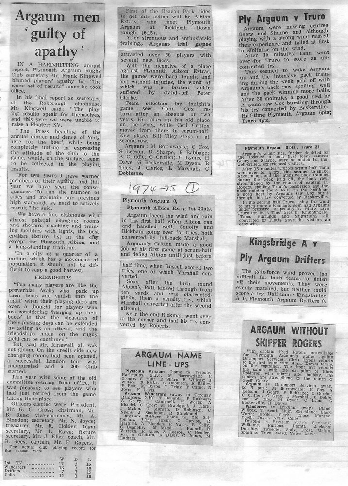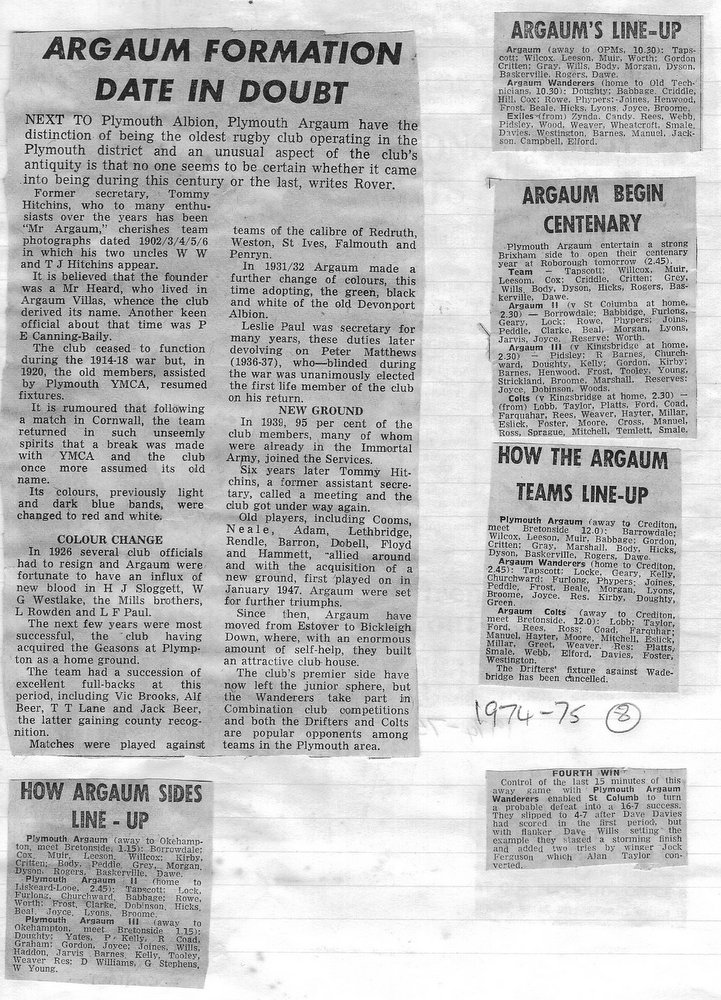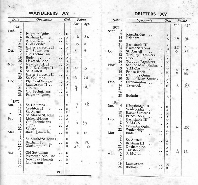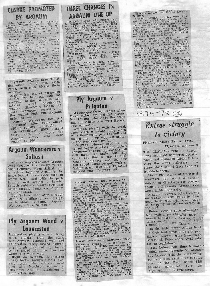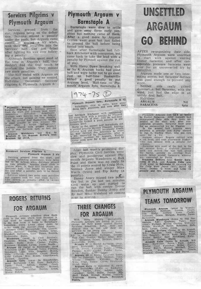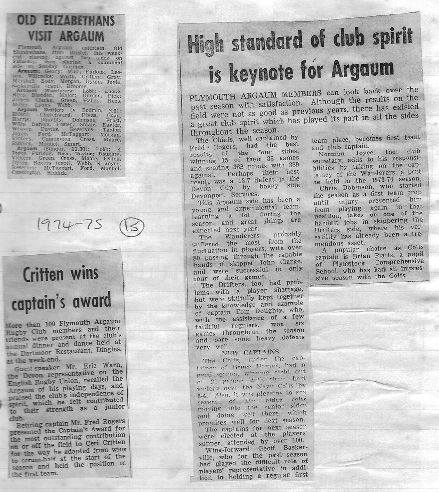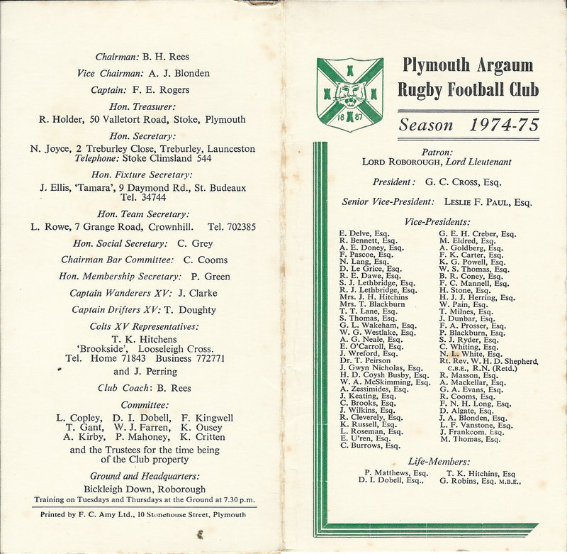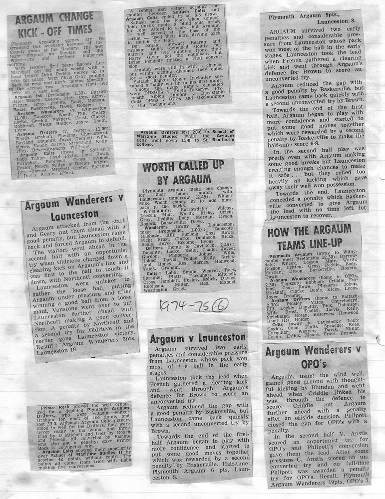 Additional Notes (R.Belli): Fred Rogers was skipper for the 1974-75 season which was one of consolidation. After beating Withycombe in the second round of the Devon Cup it was old foes Devonport Services who proved the stumbling block with a 13-7 win albeit this time at Bickleigh Down. There was a fixture at Yeovil, which involved an overnight stay on the Friday, Ceri Critten scoring a try on the way to a 13-0 victory. The Wanderers, were knocked out of the Lockie Cup by ‘Plymouth’ Combination side Launceston! It was noticeable that Tavistock, established a few seasons now, comfortably beat the Drifters in one fixture. The colts pulled off the best result of the season beating Royal Navy Colts 6-4 at Bickleigh Down. Ex-Argaum player and millionaire Peter Blackburn was killed in a car crash; the son of former President Tom, whose widow had opened the clubhouse extension the previous season. Once again a tour was arranged to London to coincide with a Five Nations match, this time England v France in late January. Fixtures were against Old Emmanuel and Met Police Special Branch, Argaum presented their hosts with giant oggies, prepared by former club member Ron Dewdney. On the subject of tourists, Bristol-based Old Elizabethians brought two sides down to play The Chiefs and Wanderers on a Saturday with a scheduled fixture of a combined side at 11:30 the following day! Off the field developments were prominent once again when the club came close to purchasing land for pitches at Bickleigh Down, however with loans and funding in place the deal fell through.