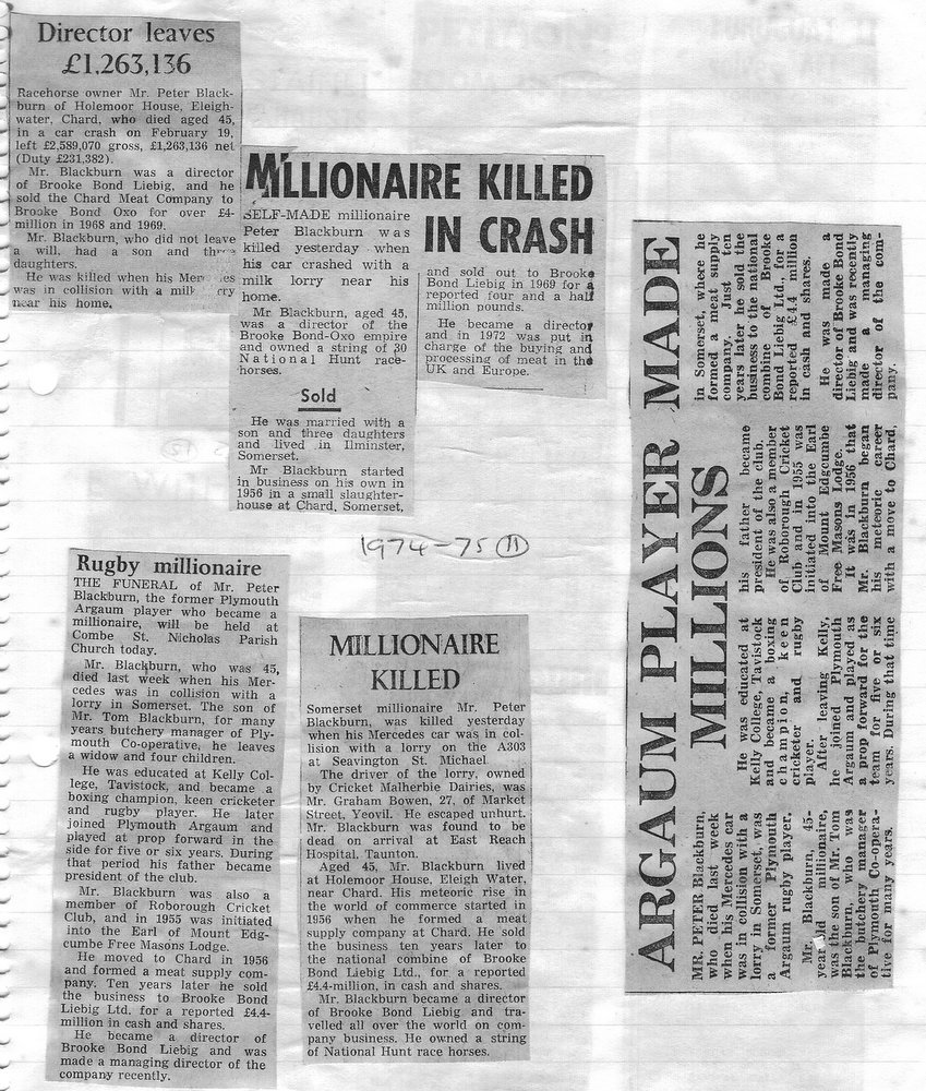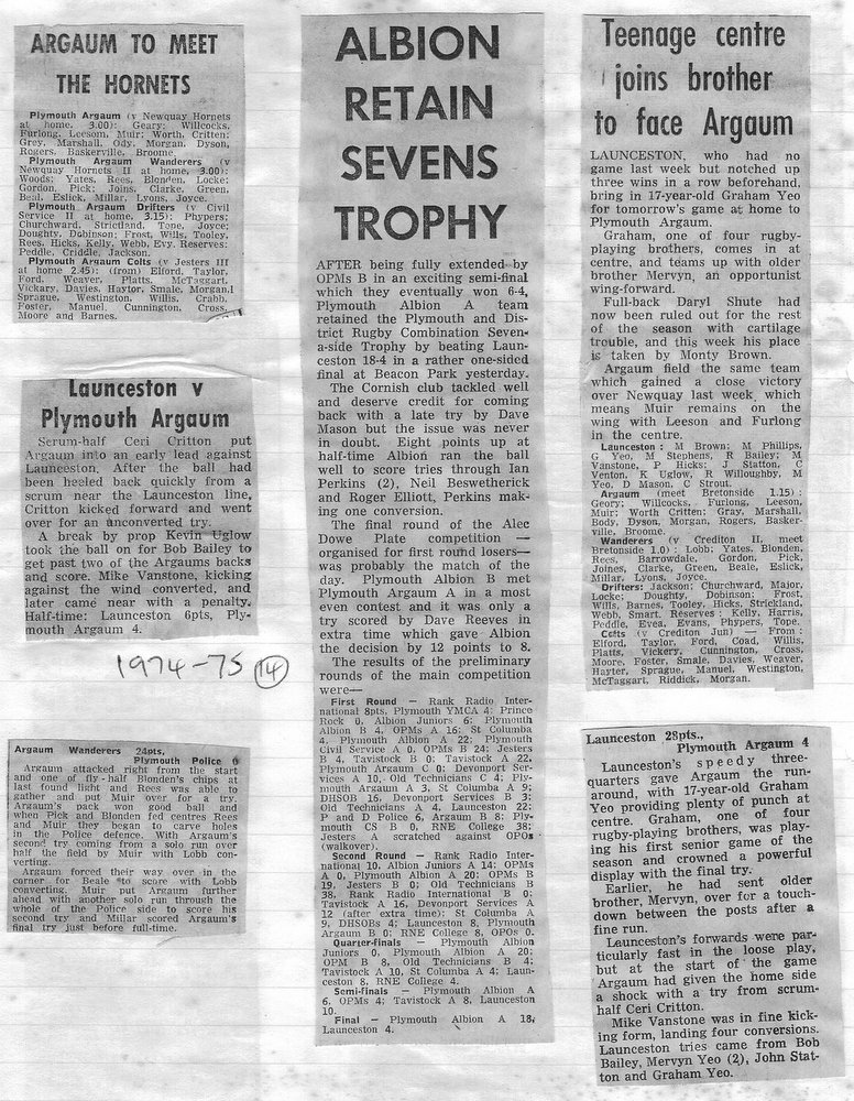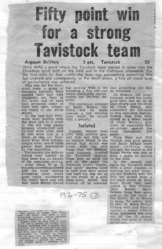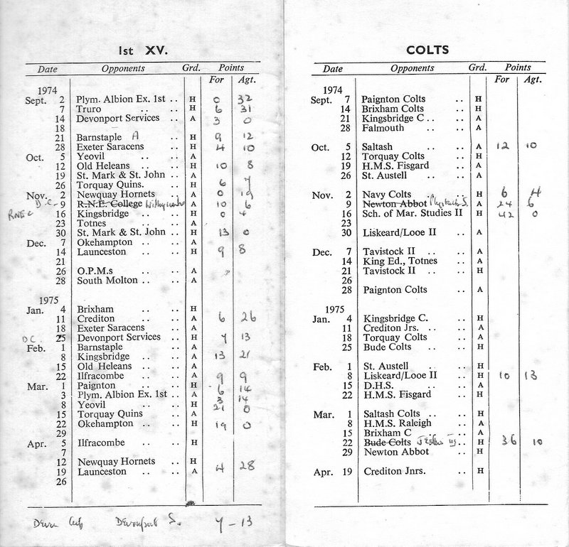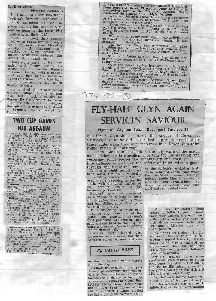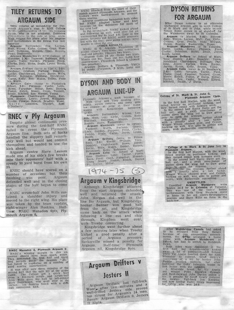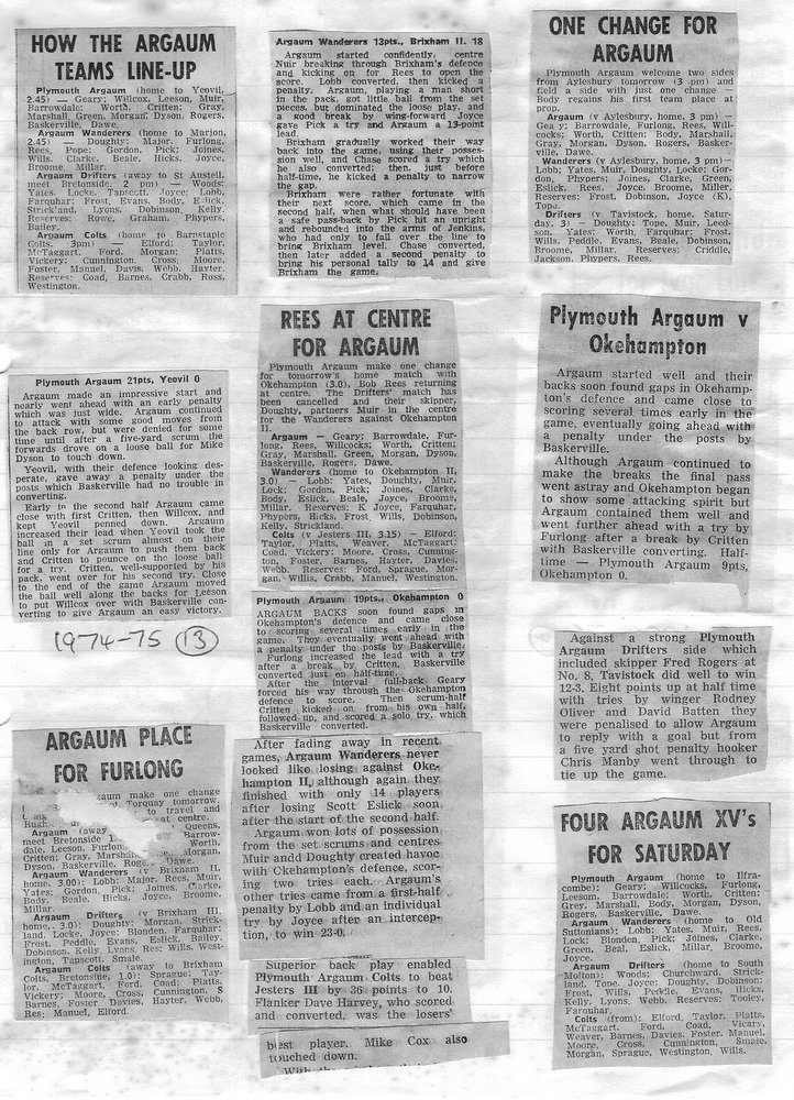 Additional Notes (R.Belli): Fred Rogers was skipper for the 1974-75 season which was one of consolidation. After beating Withycombe in the second round of the Devon Cup it was old foes Devonport Services who proved the stumbling block with a 13-7 win albeit this time at Bickleigh Down. There was a fixture at Yeovil, which involved an overnight stay on the Friday, Ceri Critten scoring a try on the way to a 13-0 victory. The Wanderers, were knocked out of the Lockie Cup by ‘Plymouth’ Combination side Launceston! It was noticeable that Tavistock, established a few seasons now, comfortably beat the Drifters in one fixture. The colts pulled off the best result of the season beating Royal Navy Colts 6-4 at Bickleigh Down. Ex-Argaum player and millionaire Peter Blackburn was killed in a car crash; the son of former President Tom, whose widow had opened the clubhouse extension the previous season. Once again a tour was arranged to London to coincide with a Five Nations match, this time England v France in late January. Fixtures were against Old Emmanuel and Met Police Special Branch, Argaum presented their hosts with giant oggies, prepared by former club member Ron Dewdney. On the subject of tourists, Bristol-based Old Elizabethians brought two sides down to play The Chiefs and Wanderers on a Saturday with a scheduled fixture of a combined side at 11:30 the following day! Off the field developments were prominent once again when the club came close to purchasing land for pitches at Bickleigh Down, however with loans and funding in place the deal fell through.