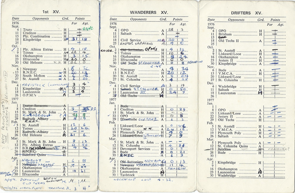 Additional Notes (R.Belli): Steve Body, ex St Lukes, was 1st XV Captain in a challenging season for the club in terms of availability and with several key players occupying committee roles. This meant that the 3rd XV ceased to operate for the first time in over 25 years. To illustrate changing fortunes of local clubs, Old Techs secured a last-minute draw at Bickleigh Down in the Devon Cup and went through as the away team, whilst ever-improving Tavistock knocked The Chiefs out of The Havill Plate. Despite this there were good home performances against the likes of St Austell, Newquay and Launceston. OPMs prevailed against The Wanderers, skippered by Chris Millar. in their Lockie Cup tie. Visiting tourists included Welsh side IPC Plastics and Bath based Oldfield Old Boys. Tony Blonden was now running the Colts, who were occasionally called upon to supplement The Wanderers. After the previous dalliance with purchasing the ground, the AGM notes record that a ‘Peppercorn rent’ had been arranged for 99 years. Tom Hitchins was now Chairman and Bill Farren, player and prominent club member for many years was made Life Member.