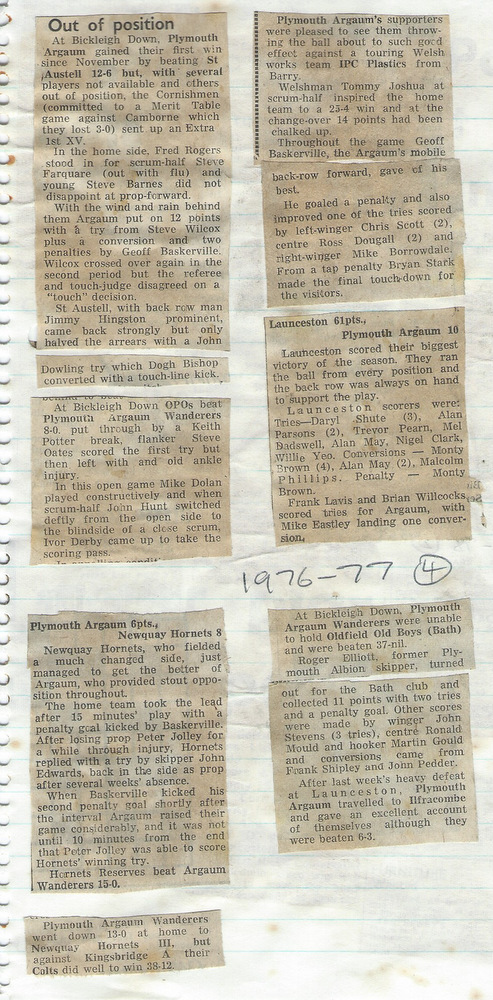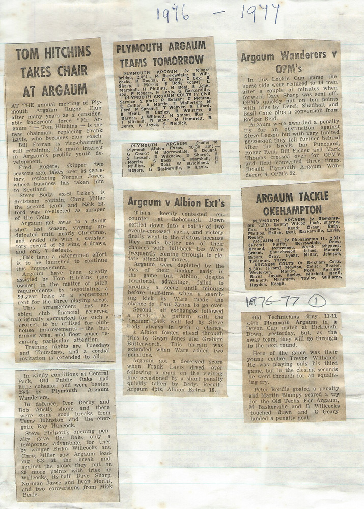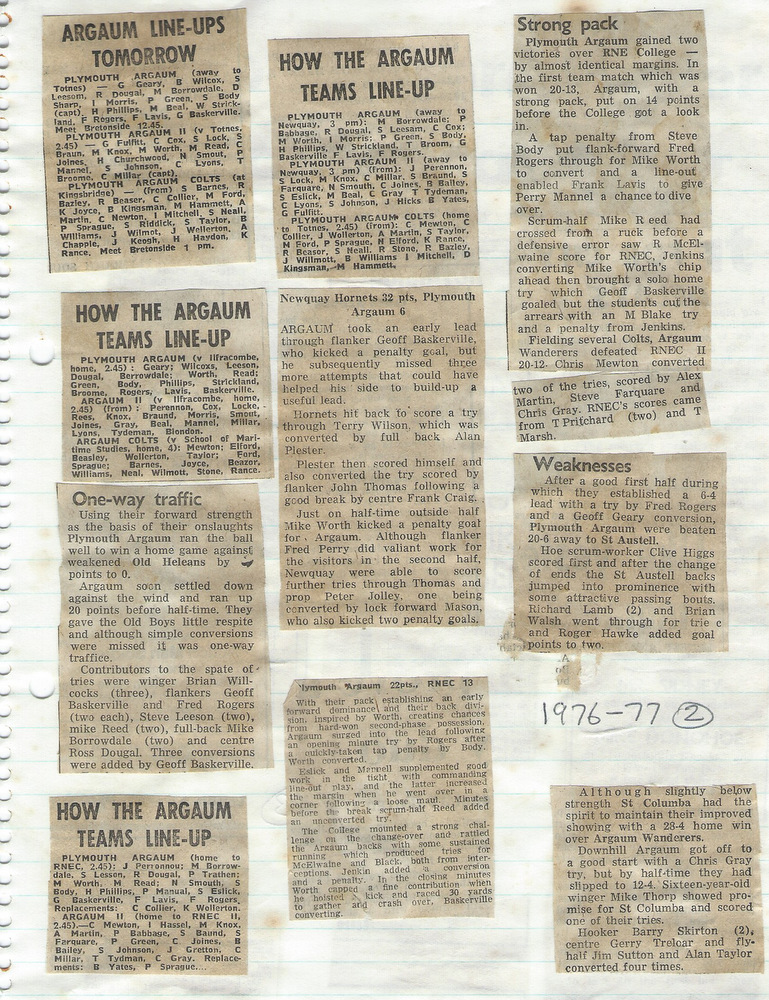 Steve Body was captain, with Fred Rogers as Secretary. There was an early defeat 4-18 at the hands of Plymouth Albion Extras, the Argaum forwards battling well, but generally the Club failed to make the most of its chances.