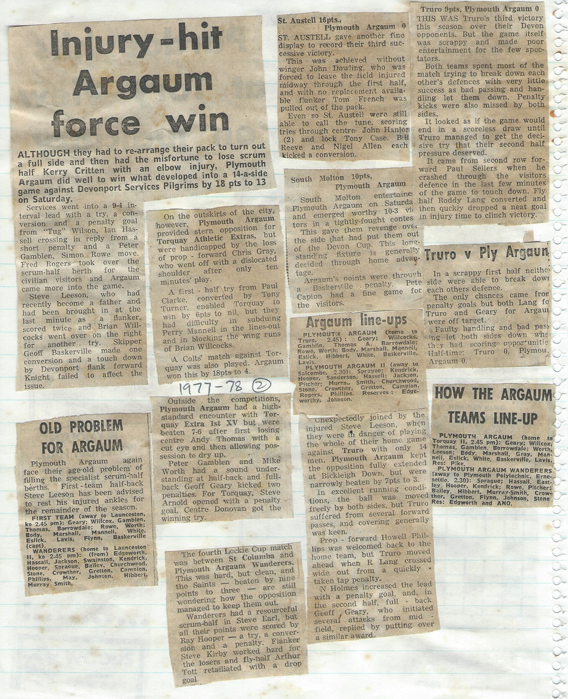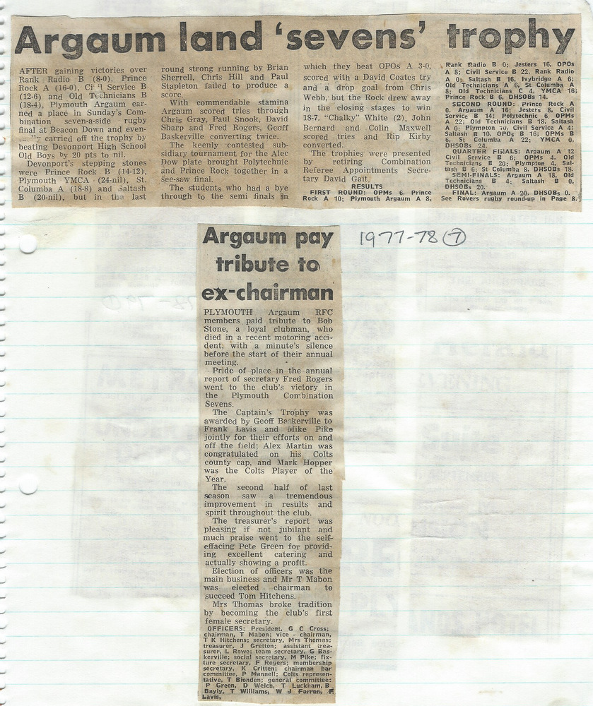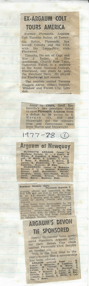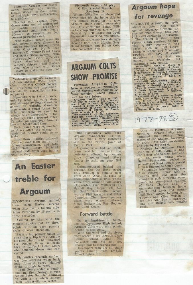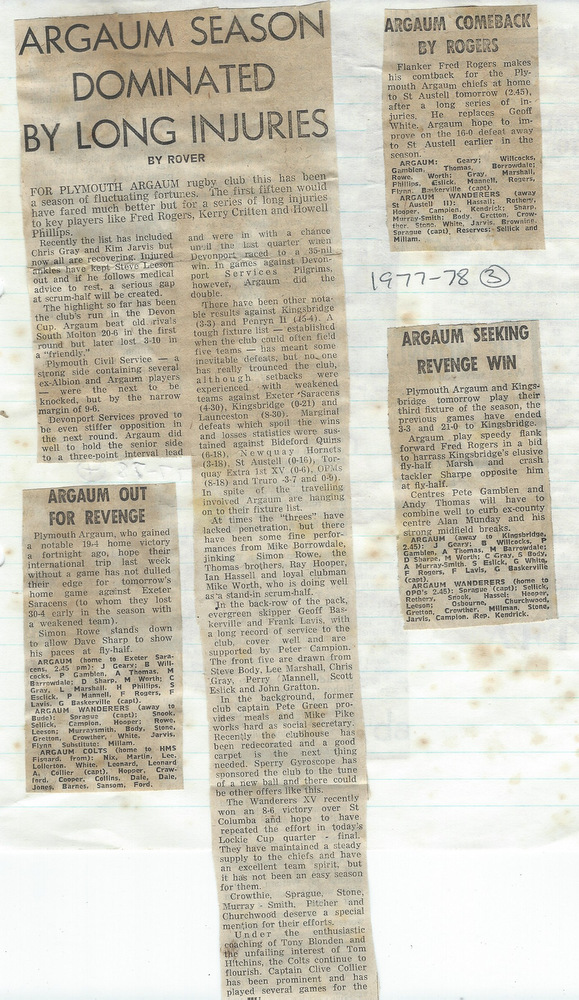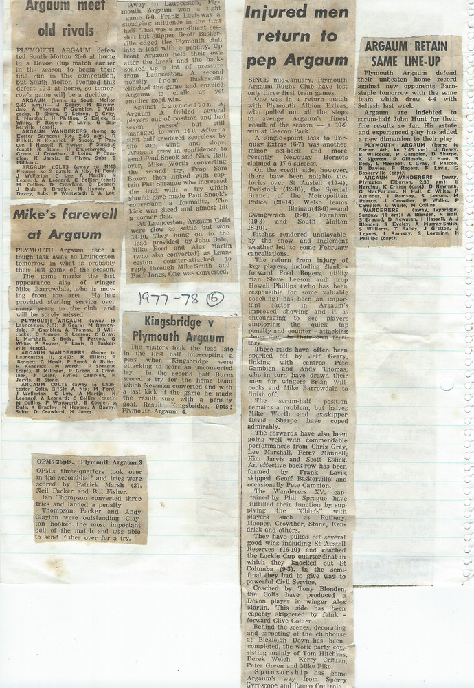 Additional Notes (R.Belli): With Geoff Baskerville in for his second stint as skipper, The Chiefs performed well and had a fairly even return in the 1977-78 season. A mini Devon Cup run saw wins over South Molton and Civil Service before Devonport Services (once again) finished it at the quarter final stage. The Wanderers under Phil Sprague, occasionally struggled for numbers but progressed in the Lockie Cup first round against St Columba only for Civil Service to avenge the county cup reverse. There were a number of Easter tourists; Blaenau, Cwmgrach, Met Police C Divison and Farnham with all being beaten by the hosts. Mike Borrowdale, in his final season for the club, scored a hat trick against the police team. The seniors won the Plymouth Combination Sevens Preliminary tournament at Beacon Down with wins over Rank radio, Prince Rock, Civil Service, Old Techs and DHSOB. The colts, under captain Clive Collier, were once again called upon to supplement the injury-ravaged senior ranks but still returned a decent set of results. Winger Alex Martin represented the county colts and also scored a try on his 1st XV debut against Tavistock. With club finances stretched in recent seasons, welcome income came from two sponsored matches (Sperry Gyroscope and Ranco Controls). At the AGM, tributes were paid to ex-chairman Bob Stone who had died in a recent motoring accident and The Ladies Committee was wound up having provided sterling service to the club for many years. (Unfortunately no fixture card for this season is available)