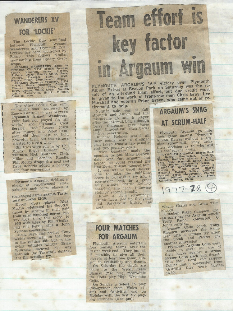 Easter tourists Blaina (S Wales) proved 48-0 victims, but Cwmgrach, also from the Principality, were sterner opposition, tries from Mike Borrowdale and Peter Campion to nil providing the difference. Alex Martin of the Colts played for Devon Colts and also scored for the 1st XV in a narrow win over Tavistock. Early in the season injuries side lined Fred Rogers, Ceri Critten, Howell Phillips, Chris Gray, Kim Jarvis and Steve Leeson for several weeks, Peter Green always prepared to put on the shirt for any team that required his services, although he was barred by the Colts – made himself responsible, doubtless in his spare time, if any, for preparing and serving no less than 680 meals to visiting sides.
