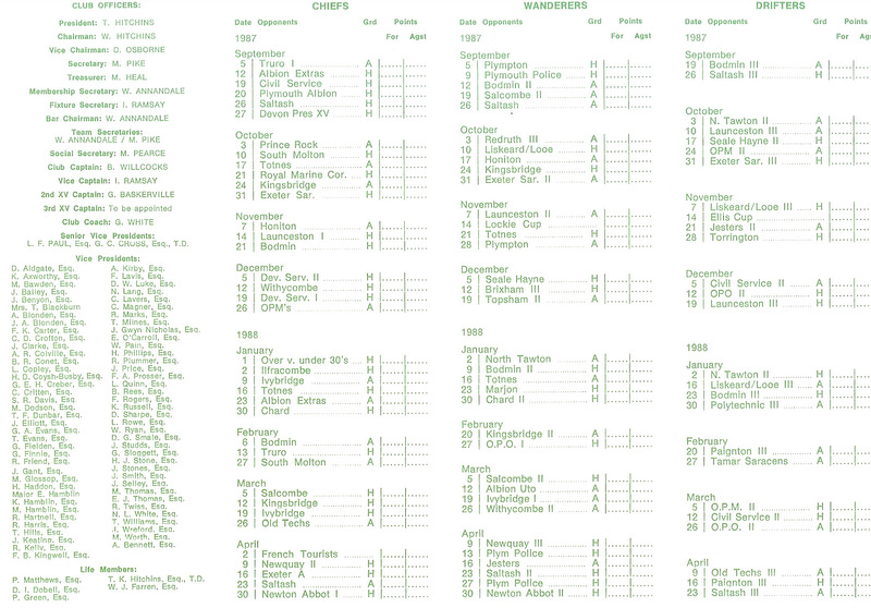 There were a number of special fixtures including matches against Devon, Plymouth Albion and Devonport Services which stretched the club’s playing resources. Despite this, three teams were fielded. The Chiefs played a mammoth 38 fixtures, winning 11 and drawing 1. Geoff Baskerville’s Wanderers won 13 of their 31 fixtures, whilst The Drifters under Pete Duff performed commendably to fulfil 27 fixtures, winning 3.
