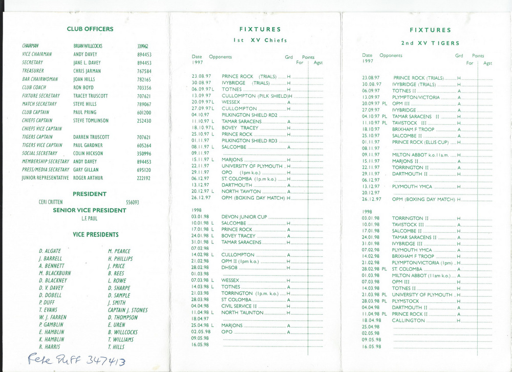 The Devon 2 division was now 10 teams strong (including new boys Wessex) with a 6 team Devon 3 now below it. The first league match was postponed due to another funeral, that of Princess Diana, on 6th September. When the fixtures did get underway, the Chiefs found themselves a bit off the pace, suffering a bit of a hangover from last season’s near-promotion. Missing some key players who had departed during the summer, notably Rob Humphries and Mark Hunt to Civil Service, victories were much harder to come by. Compounded by availability issues, consistency of selection was a major factor and the Tigers squad were plundered regularly. There was no lack of spirit though and a hard fought draw at North Tawton on the Saturday before Christmas sticks in the memory. During the season, coach Ron Boyd stood down and Andy Davey took over the role.